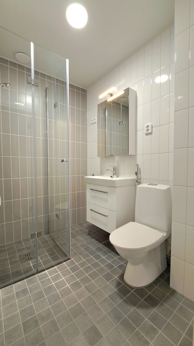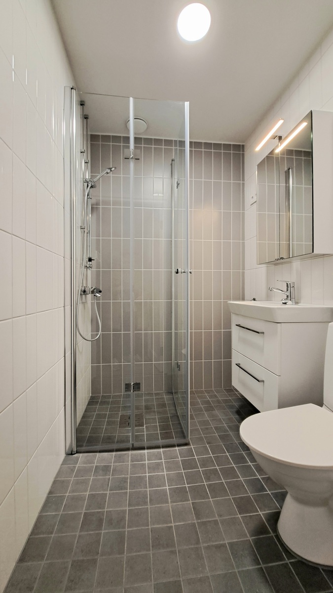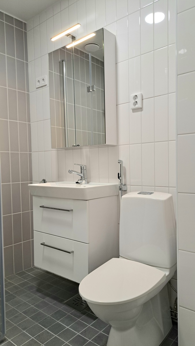 Pesukoneliitäntä, suihkuseinä, wc-istuin, allaskaappi, lattialämmitys, peilikaappi, suihku ja kiinteät valaisimet, seinät (kaakeli), lattiat (laatta), Koko kylpyhuone saneerataan uudeksi LVIS-remontin yhteydessä, wc yhdistetään kylpyhuoneeseen ja keittiön seinää siirretään lisätilaksi. YK 4.4.2024 päätös: Remontin valmistumisen jälkeen näiden yksiöiden märkätilojen kunnossapitovastuu on yhtiöllä. |