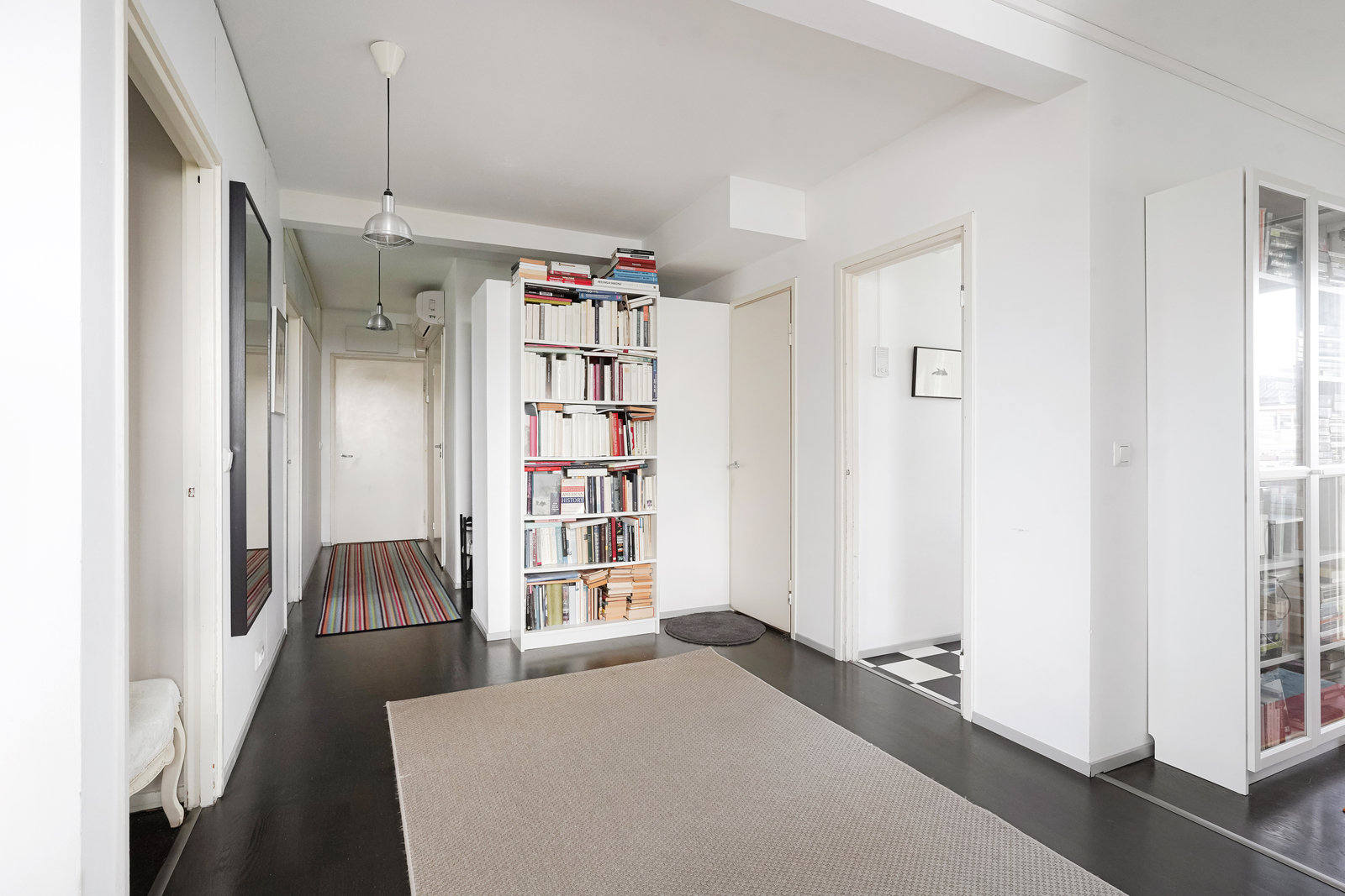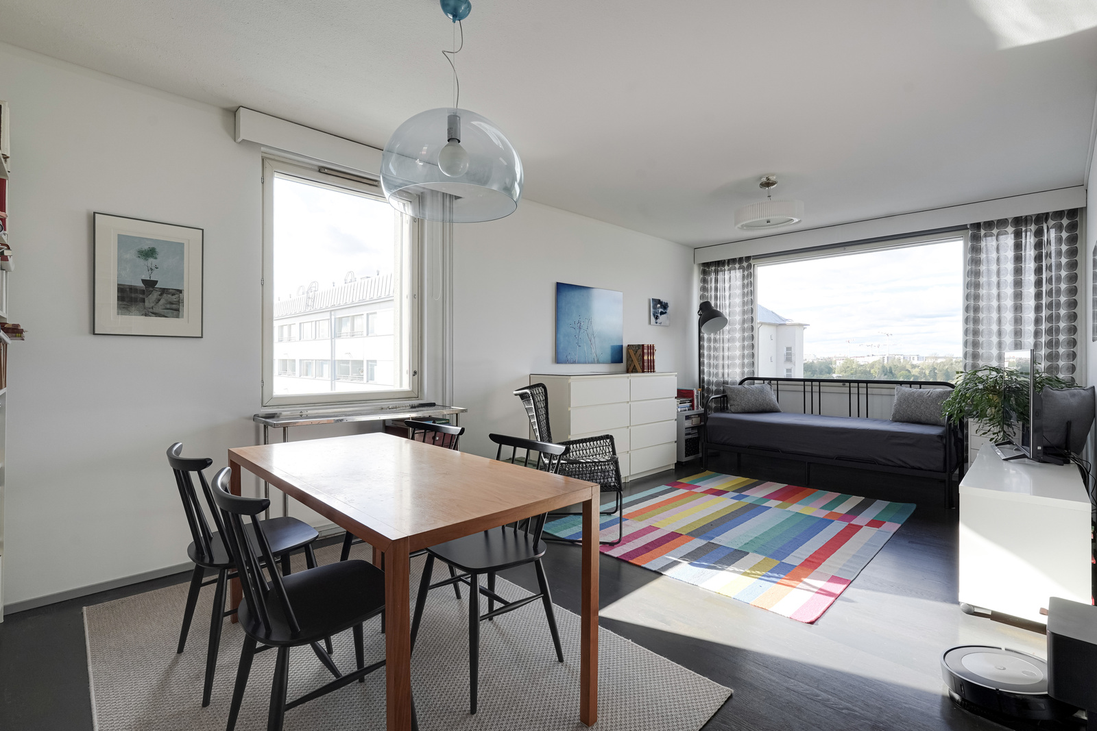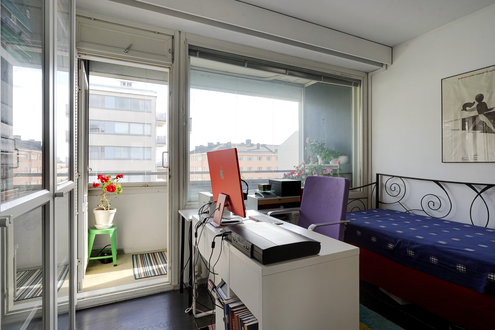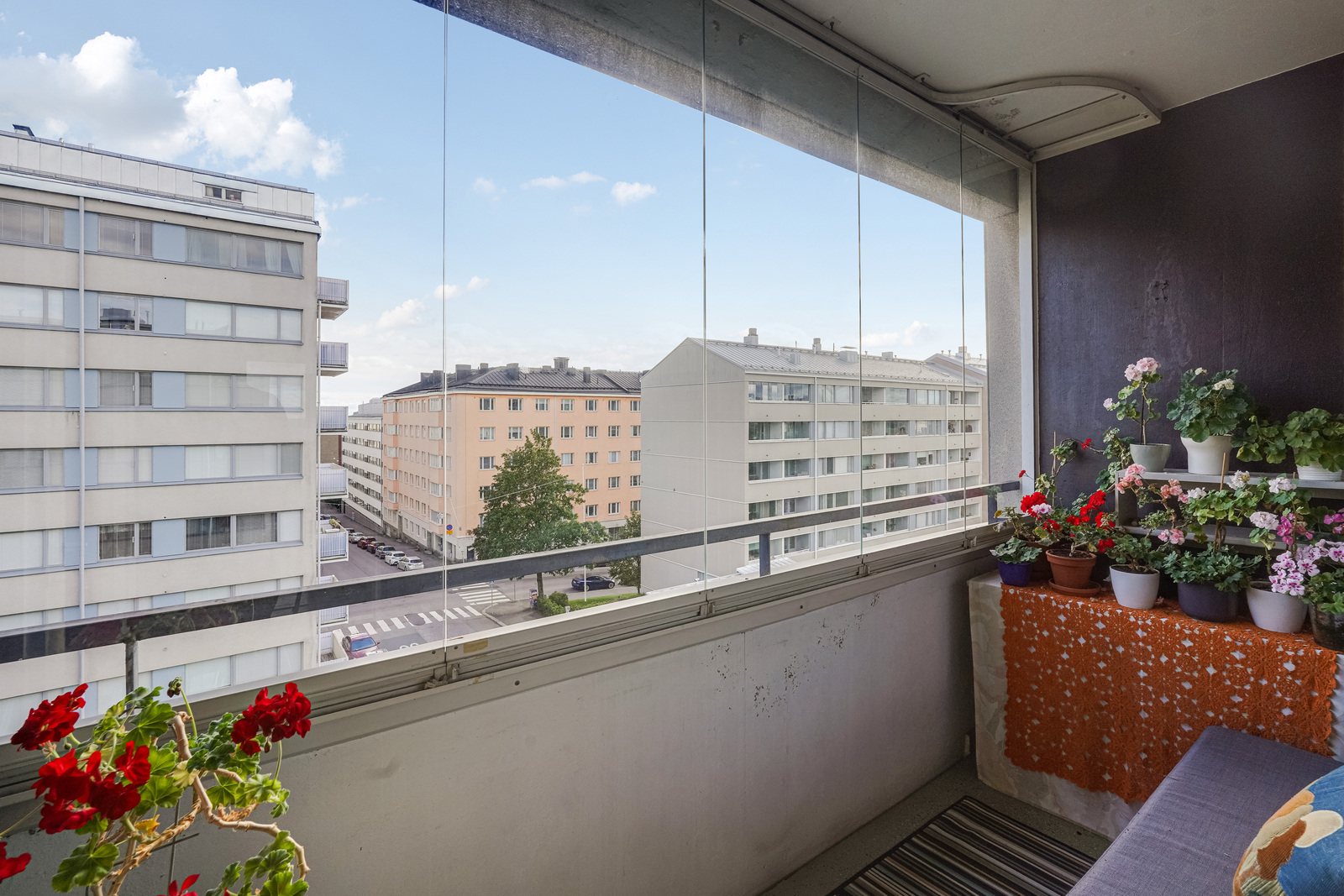 Helsingin siluetti avautuu harvinaisen korkealta muodostaen ainutlaatuisen alati vaihtuvan maisemataulun ja viitekehyksen tälle kodille. Tämä ihana asunto sijaitsee seitsemännessä kerroksessa taaten yksityisyyttä ja hiljaisuutta. Kaksi lasitettua parveketta on eri ilmansuuntiin ja ovatkin täydellisiä paikkoja niin aamukahville kuin iltahetkiin.