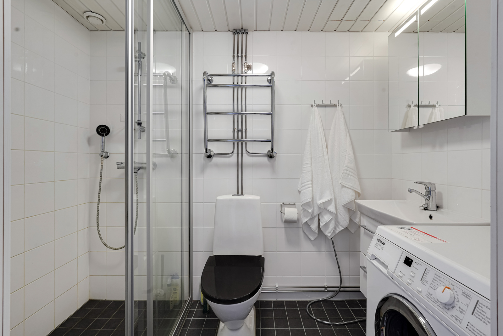 | Kylpyhuoneen kuvaus | Pesukoneliitäntä, suihkukaappi, allaskaappi, suihku, peilikaappi, wc-istuin, lattialämmitys ja asennettuja erikoisvarusteita, kiinteät valaisimet, seinät (kaakeli), lattiat (laatta) |