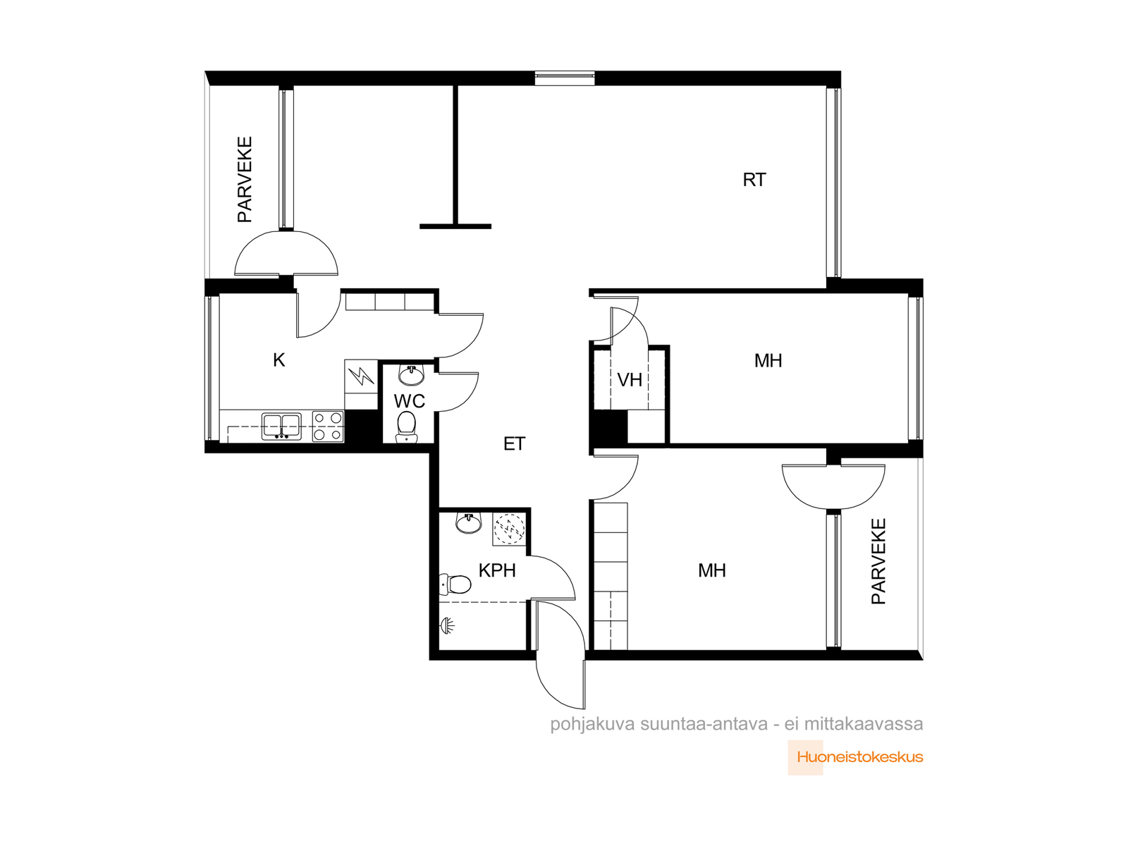 | Huoneistoselitelmä | 4 h,k, wc, kph, vh, 2x parveke (yj. 4h+k) |