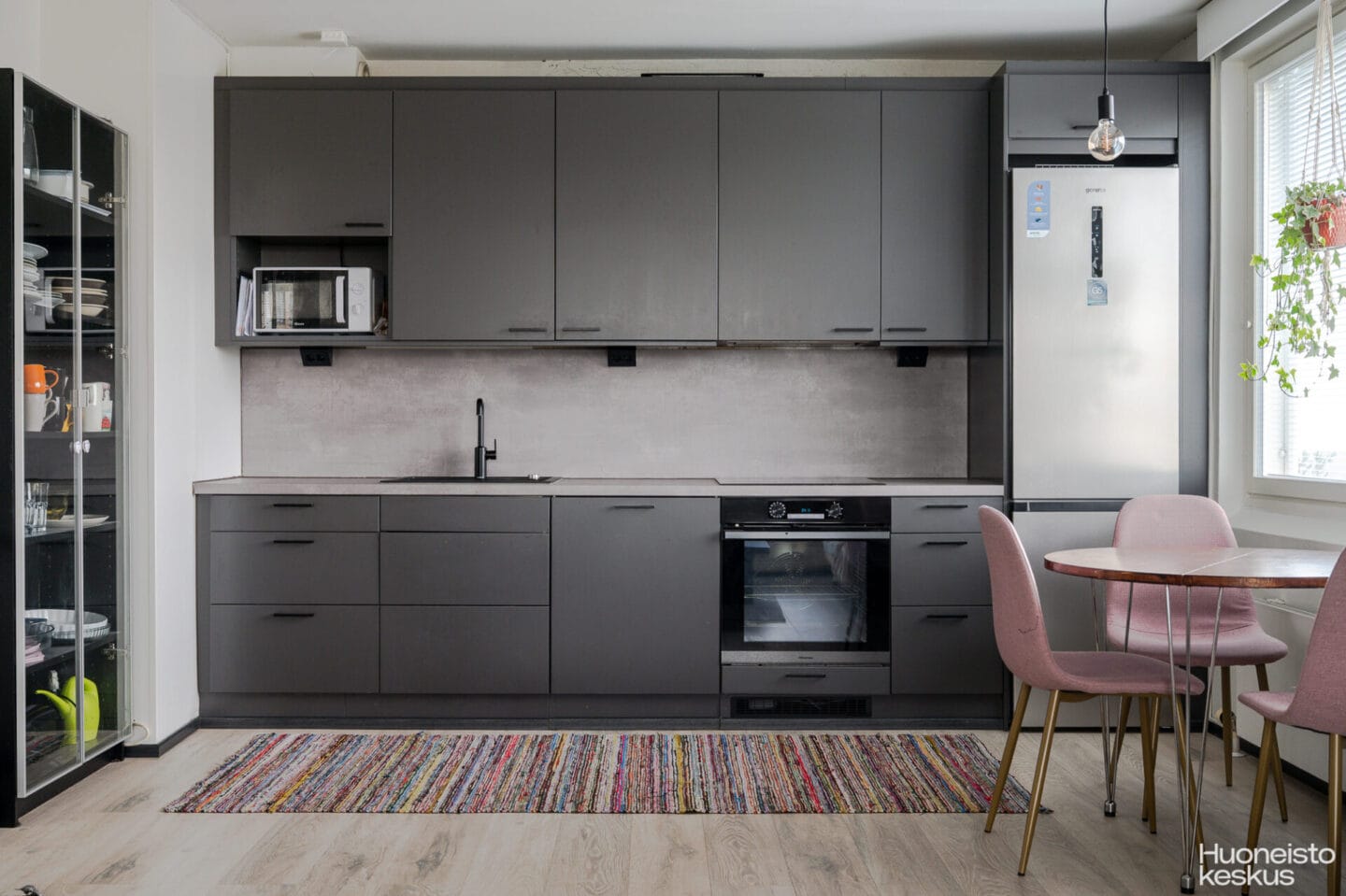 Kauniissa tummassa keittiössä on käytetty kaikki tila hyödyksi ja näin ollen keittiö on näppärä ja toimiva kokonaisuus. Olohuoneesta on tullut remontin myötä yhtenäistä tilaa ja avaraan huoneeseen mahtuu suuri sohva, jossa voi rentoutua arjen keskellä. Ilmalämpöpumppu tuo tarvittavan viileyden kesän helteisiin. Lasitettu parveke toimii lisähuoneena aikaisesta keväästä pitkälle syksyyn. Makuuhuoneen yhteydessä oleva vaatehuone tuo lisää säilytystilaa. Vaaleasävyiseen kylpyhuoneeseen mahtuu kompakteista neliöistä huolimatta myös pesukone.