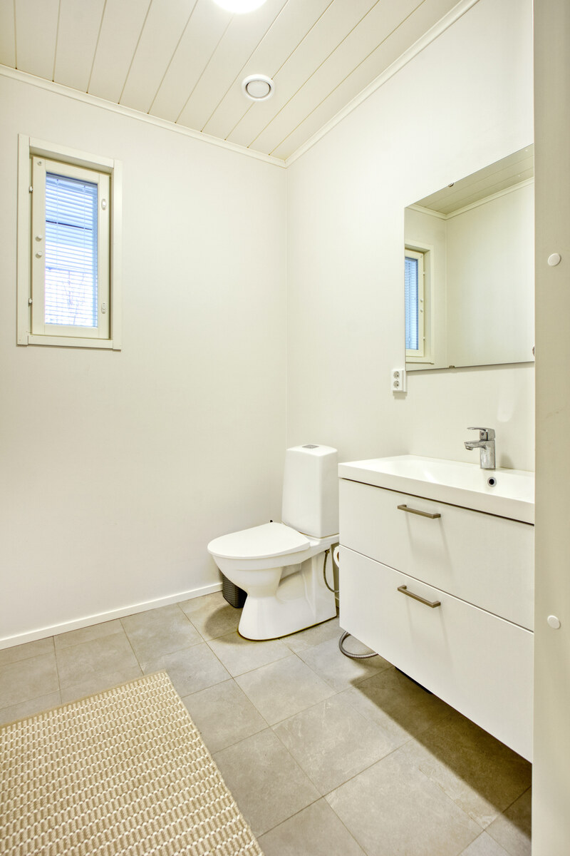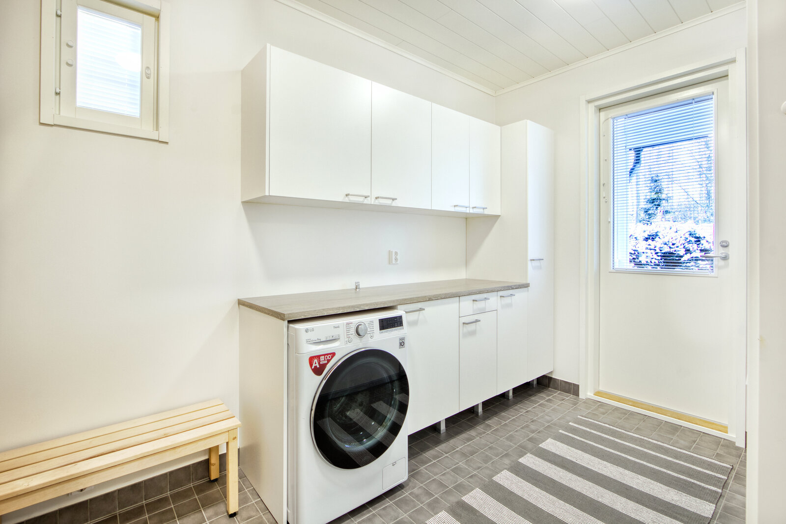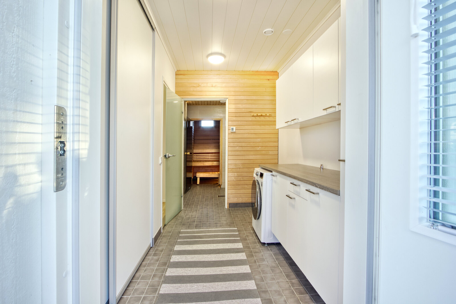 Kodinhoitohuoneessa on hyvin tilaa pyykkihuollolle ja siitä on käynti suoraan ulos, saunassa nautit sen antamista lempeistä löylyistä ja suihkussa virkistyt kylvyn lomassa, lisäksi erillinen wc.