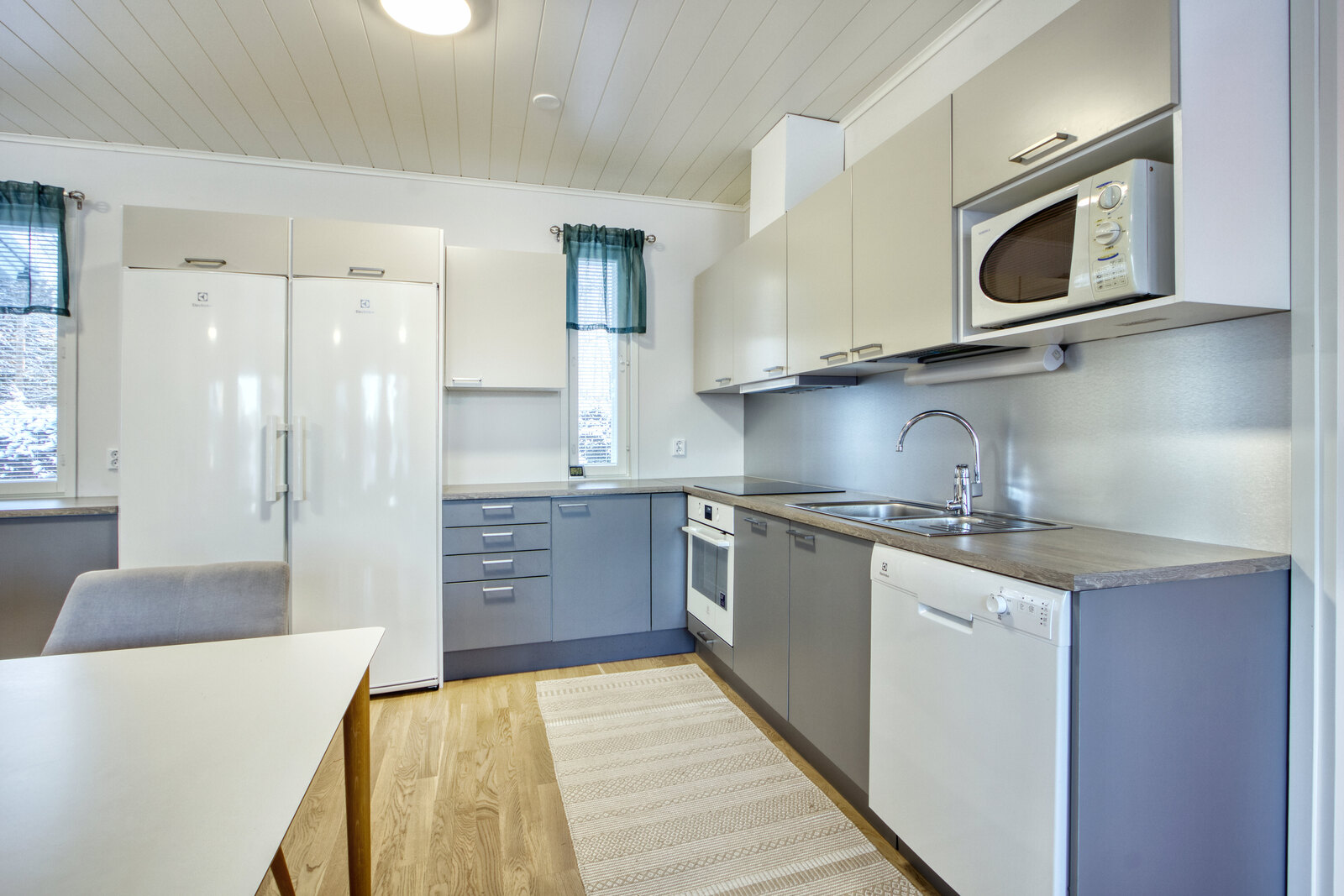 | Keittiön kuvaus | Liesi (Keraaminen liesi ja leivinuuni), työtasot (laminaatti), seinät (maali), lattiat (laminaatti), jääkaappi, erillinen pakastin, liesituuletin, astianpesukone, uuni ja kiinteät valaisimet |
