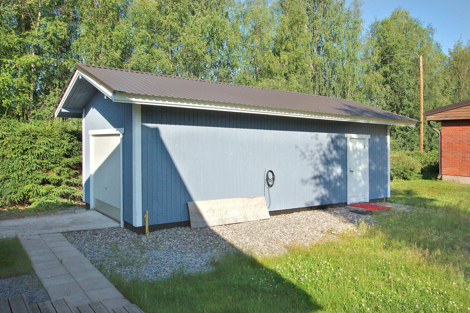 Pihalla erillinen autotallirakennus jonka yhteydessä aitta, rakennus on valmistunut 2017 vuonna. Kaupat ja kunnan palvelut kävelymatkan päässä, viralliselle uimarannalle matkaa 100 metriä.