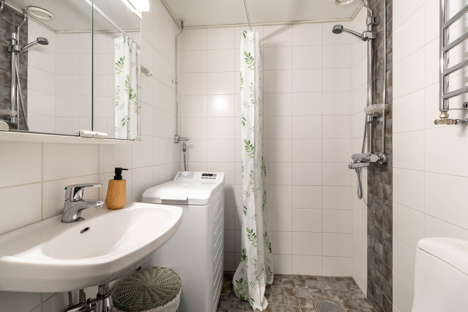 Suihku, wc-istuin, lattialämmitys, peilikaappi ja pesukoneliitäntä, seinät (kaakeli), lattiat (laatta), vesikiertoinen pyyhekuivain. |