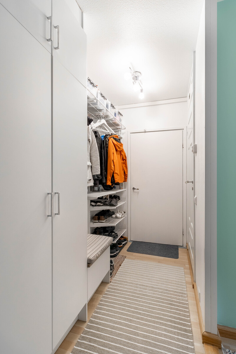 Eteisessä ja mh kaapistossa säilytysratkaisuna Elfan hyllystö. |