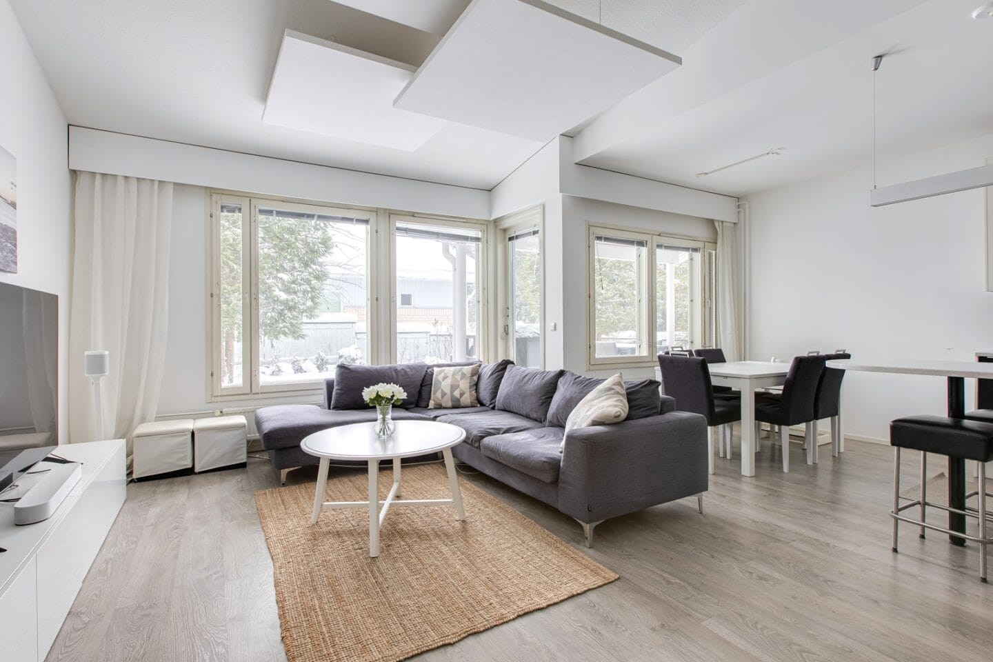 Kodin sydän on avara olohuone, joka yhdistyy saumattomasti hyvin varusteltuun keittiöön. Keittiössä on modernit laitteet, kuten induktioliesi ja kvartsikomposiittitasot, jotka tekevät ruoanlaitosta nautinnon. Kaksi makuuhuonetta tarjoavat rauhalliset tilat lepoon ja säilytystilaa löytyy runsaasti vaatehuoneen ja kaapistojen ansiosta.