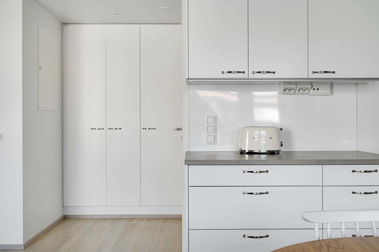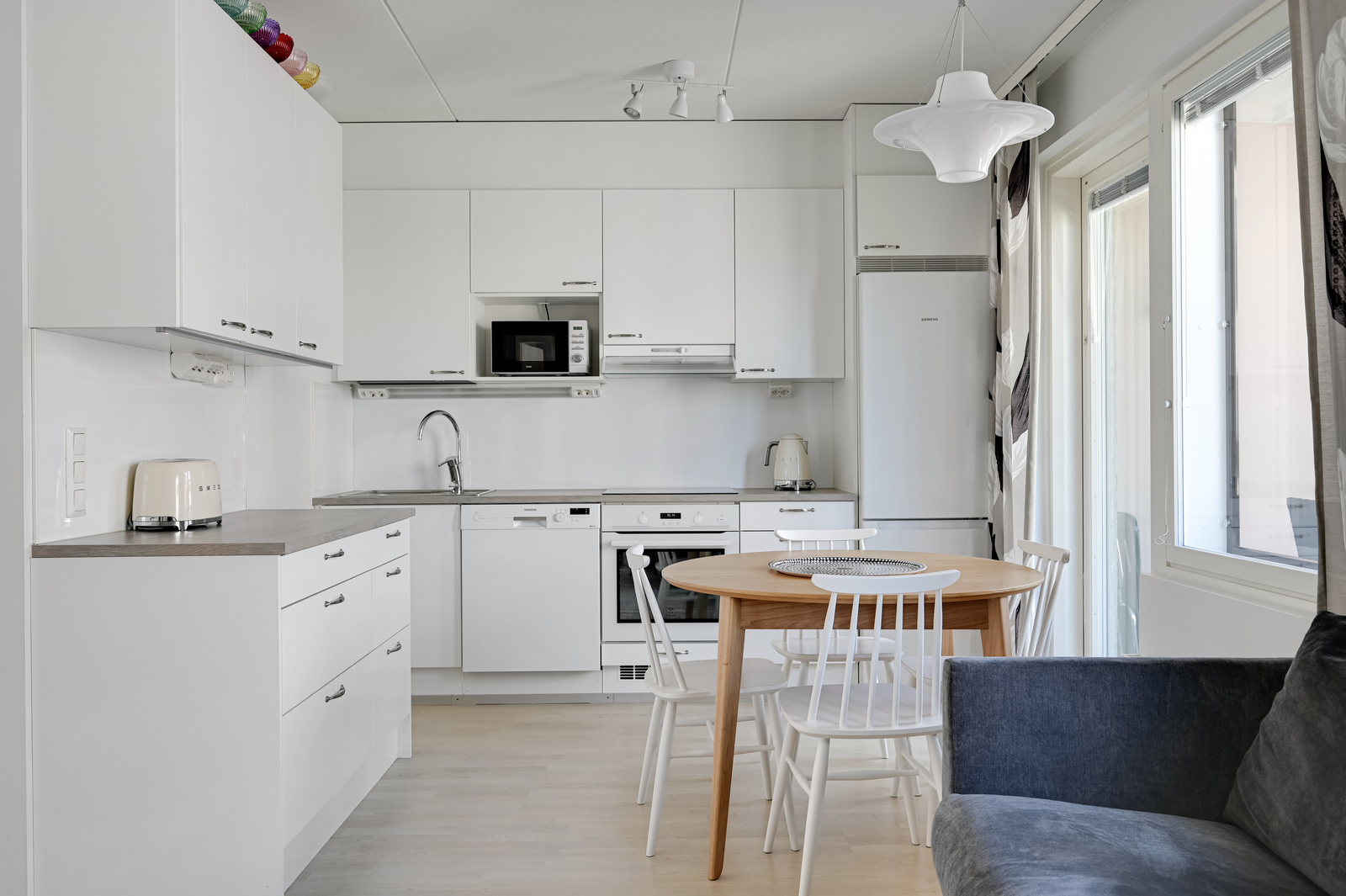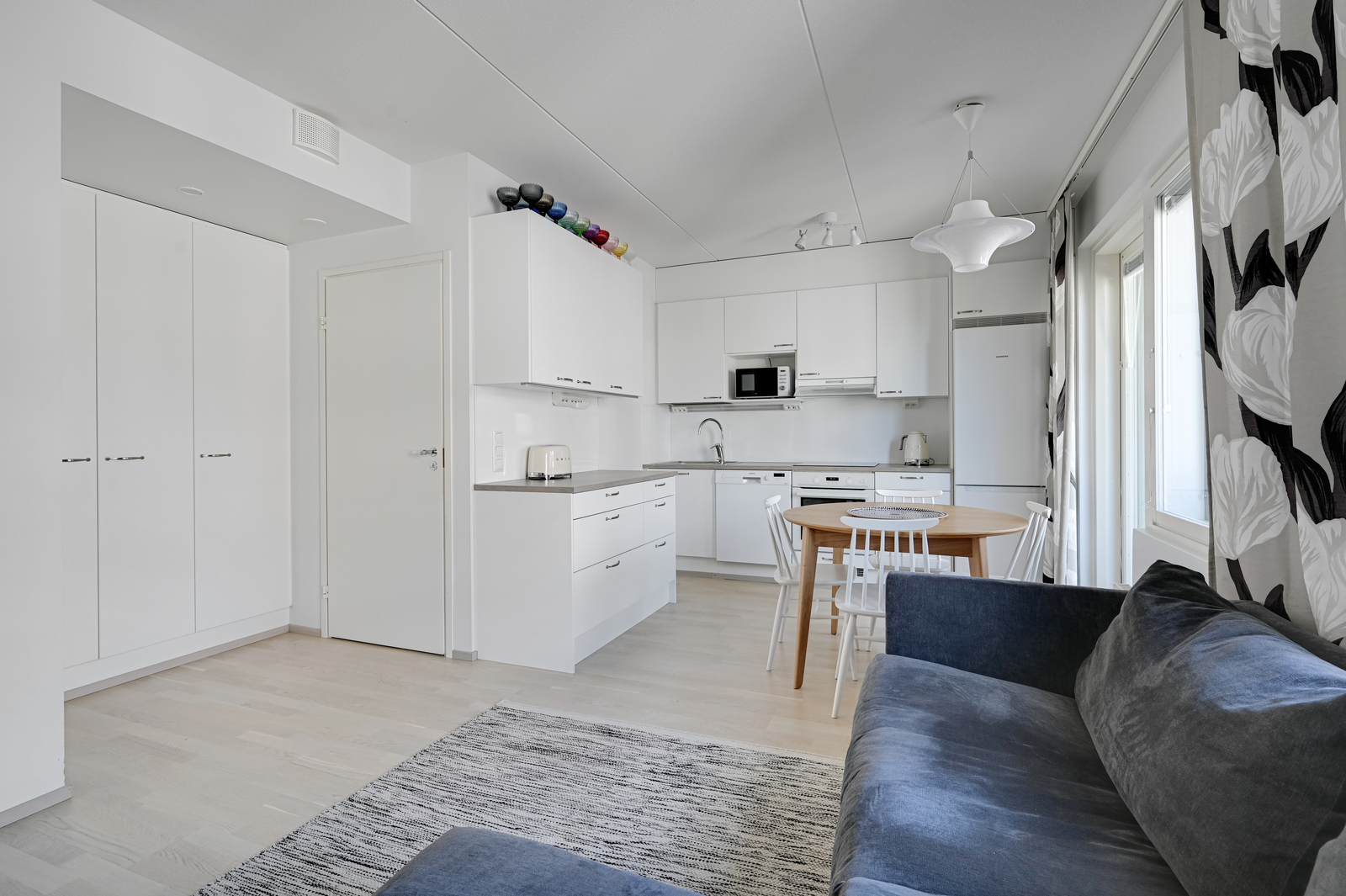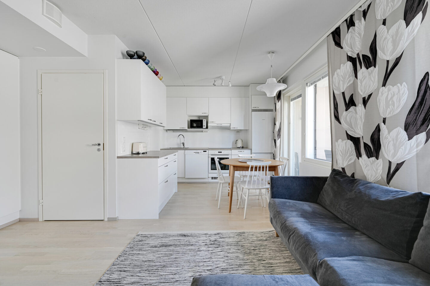 Huolellisesti suunniteltu pohjaratkaisu tekee tilasta valoisan ja avaran. Keittiö on tyylikäs ja käytännöllinen, se yhdistyy luontevasti olohuoneeseen, jossa on hyvin tilaa niin oleskeluun kuin ruokailuun. Keittiöstä avautuu lasitettu parveke, joka toimii lisähuoneena keväästä pitkälle syksyyn.
