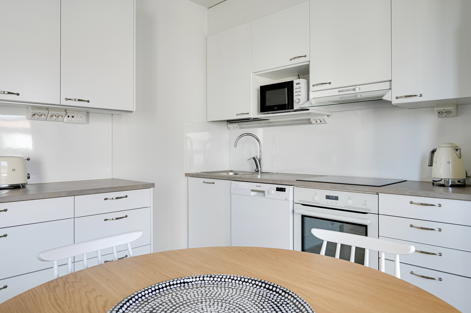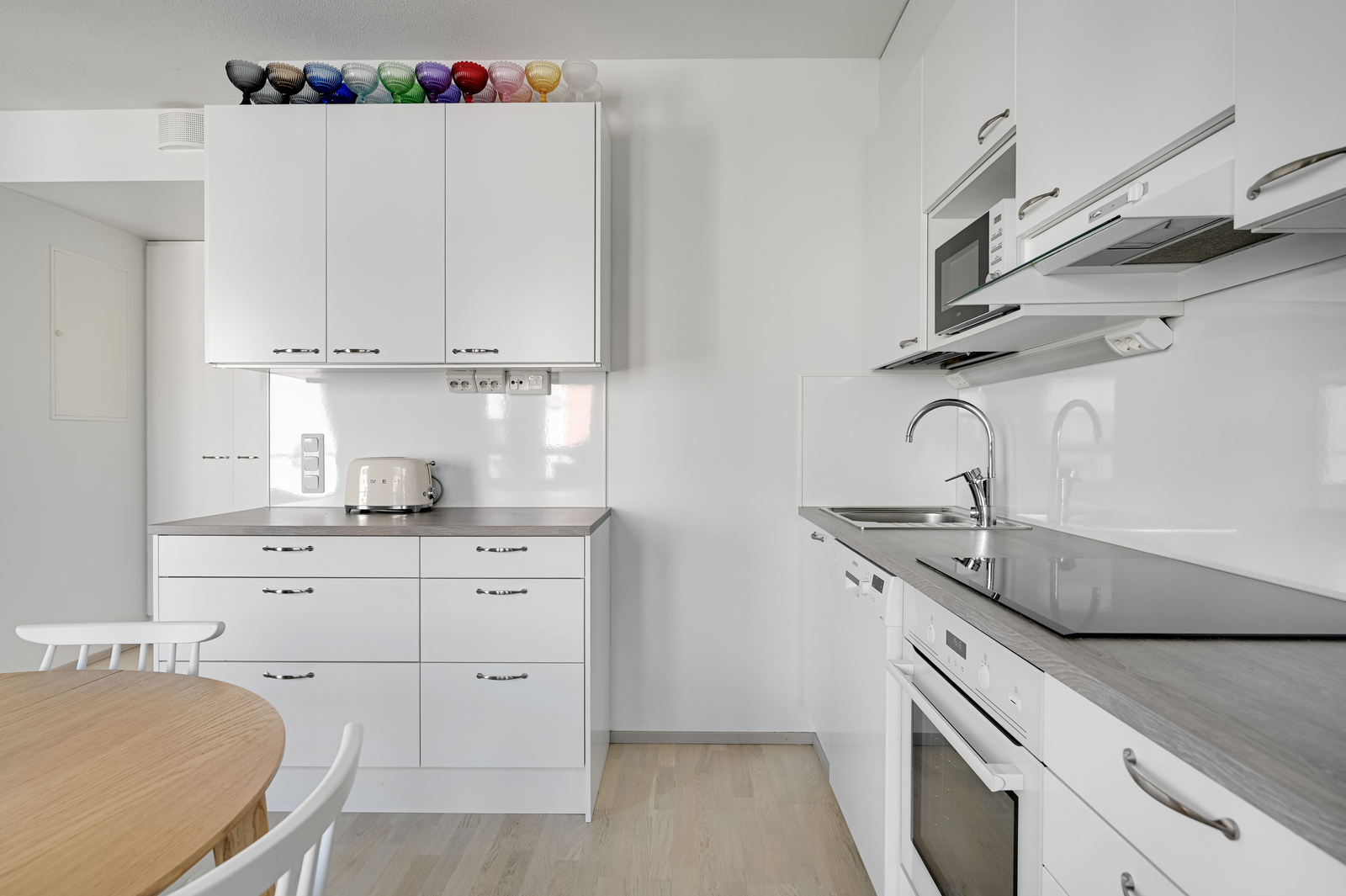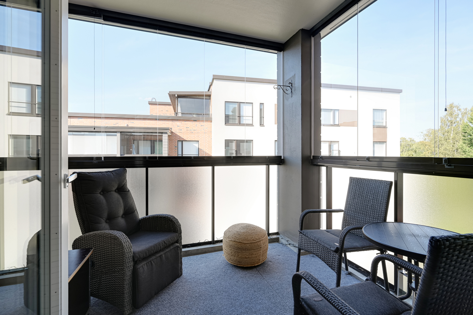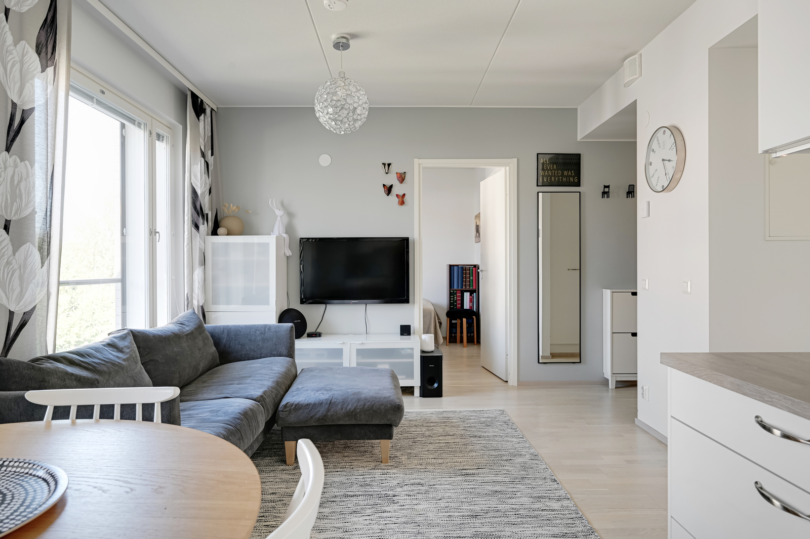 Huolellisesti suunniteltu pohjaratkaisu tekee tilasta valoisan ja avaran. Keittiö on tyylikäs ja käytännöllinen, se yhdistyy luontevasti olohuoneeseen, jossa on hyvin tilaa niin oleskeluun kuin ruokailuun. Keittiöstä avautuu lasitettu parveke, joka toimii lisähuoneena keväästä pitkälle syksyyn.