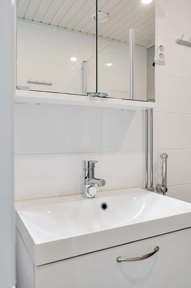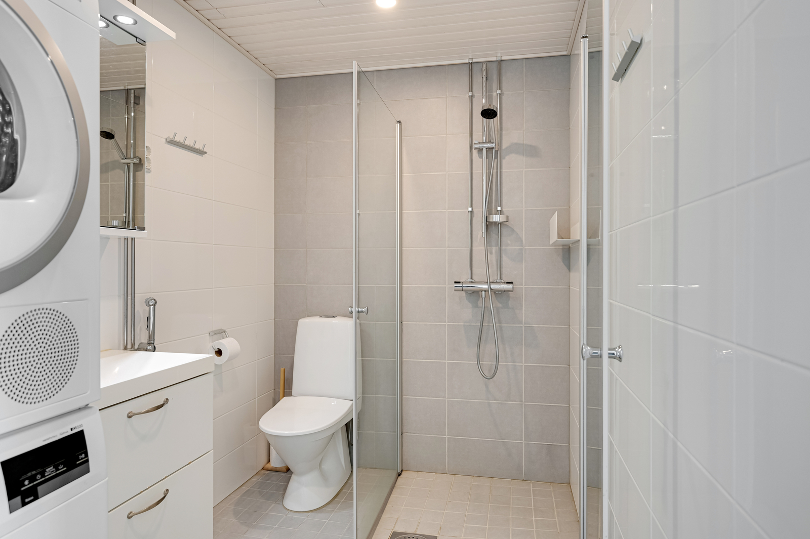 | Kylpyhuoneen kuvaus | Suihku, allaskaappi, lattialämmitys, suihkuseinä, wc-istuin, peilikaappi ja pesukoneliitäntä, seinät (kaakeli), lattiat (laatta) |