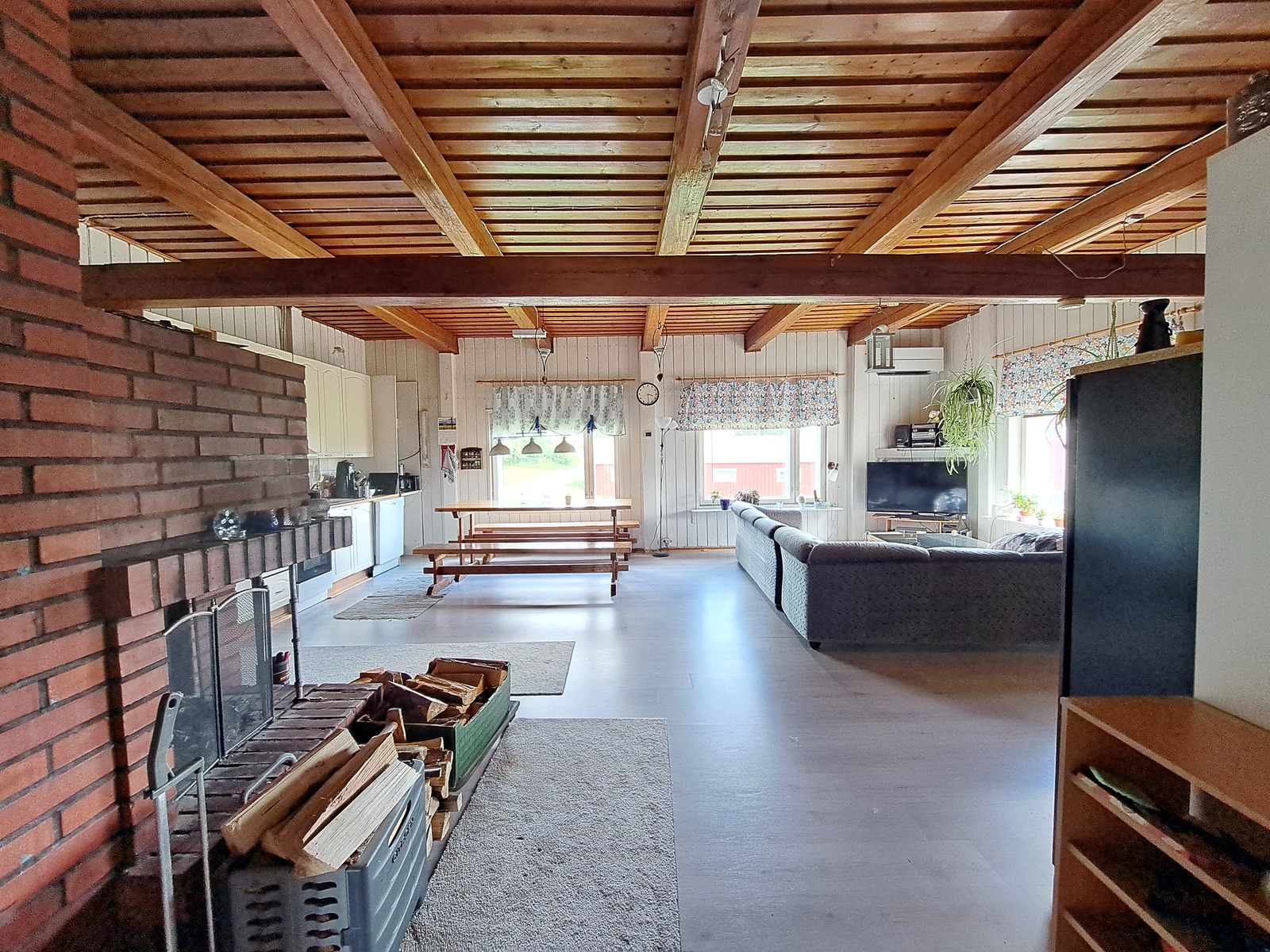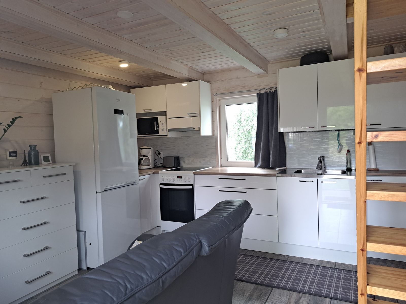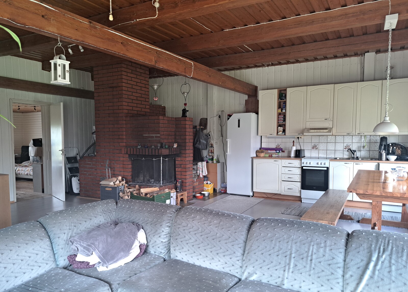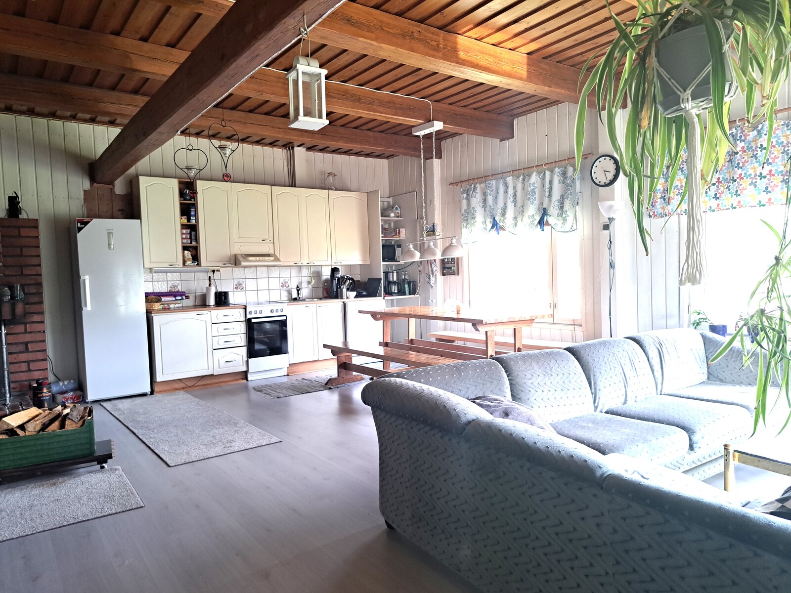 Liesi (Keraaminen liesi ja leivinuuni, puuliesi), työtasot (laminaatti), seinät (maali ja puu), lattiat (laminaatti), liesi, jääkaappi, uuni, liesituuletin, astianpesukone ja kiinteät valaisimet |