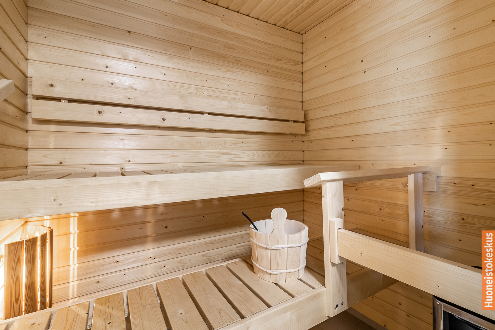 | Saunan kuvaus | Seinät (puu), lattiat (laatta), Sähkökiuas |