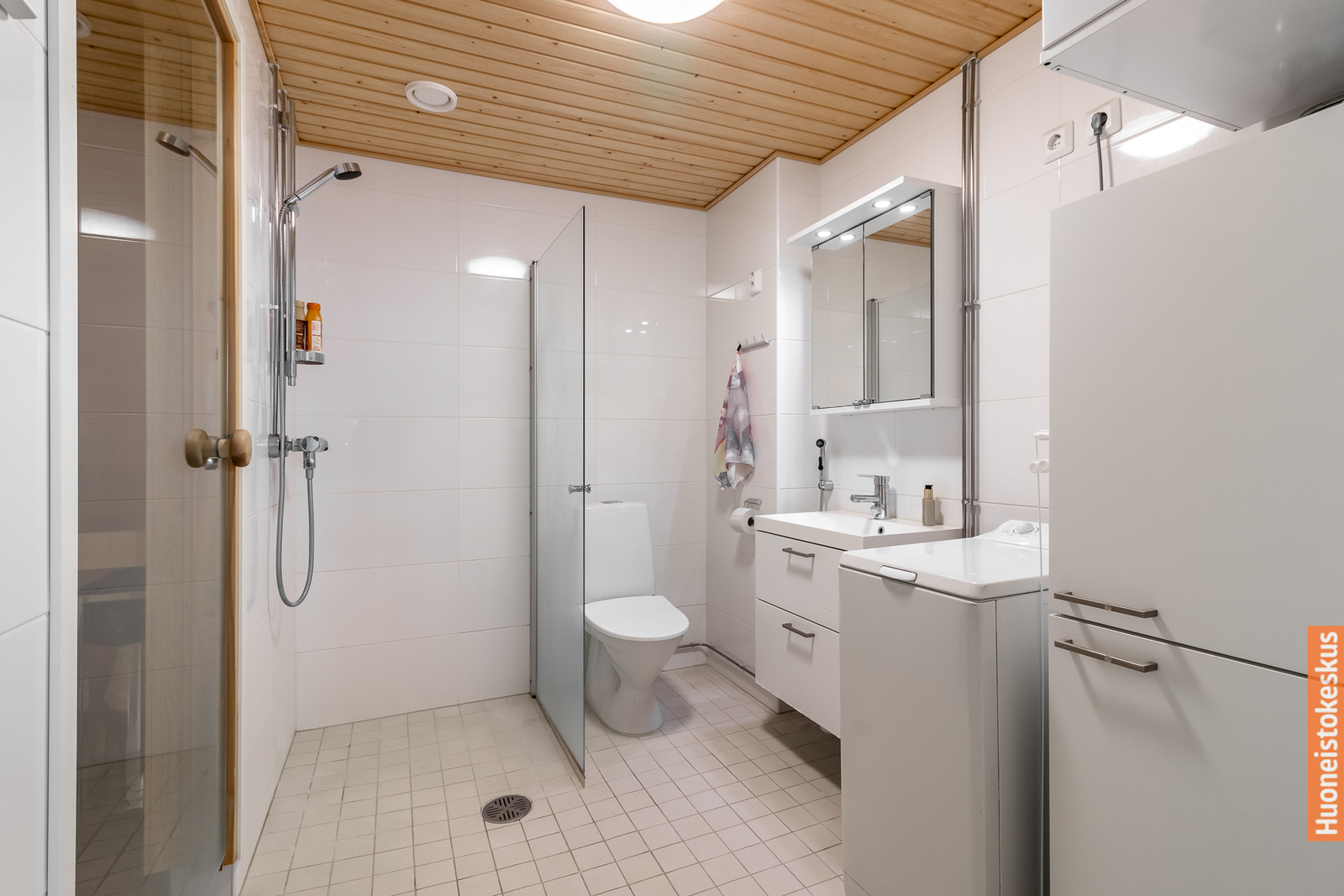 | Kylpyhuoneen kuvaus | WC-istuin, lattialämmitys, allaskaappi, peilikaappi, suihkuseinä, pesukoneliitäntä ja kiinteät valaisimet, seinät (kaakeli), lattiat (laatta) |