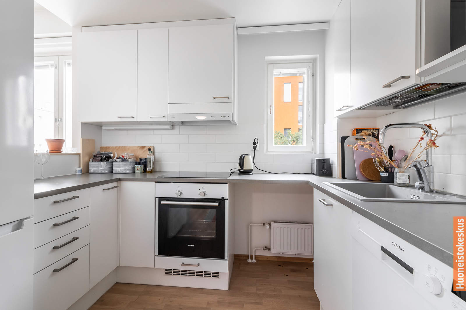 | Keittiön kuvaus | Liesi (Induktioliesi), työtasot (laminaatti), seinät (maali), lattiat (parketti), liesi, jääkaappipakastin, liesituuletin, astianpesukone ja kiinteät valaisimet |