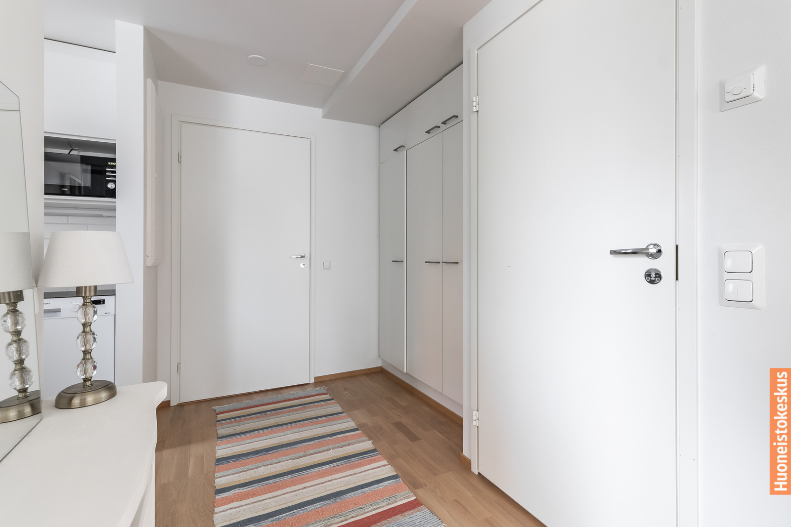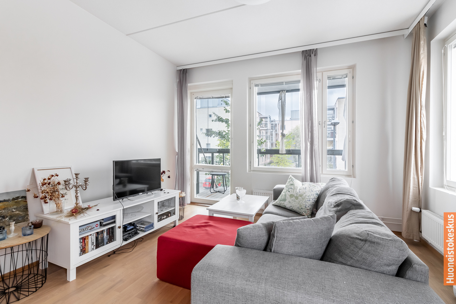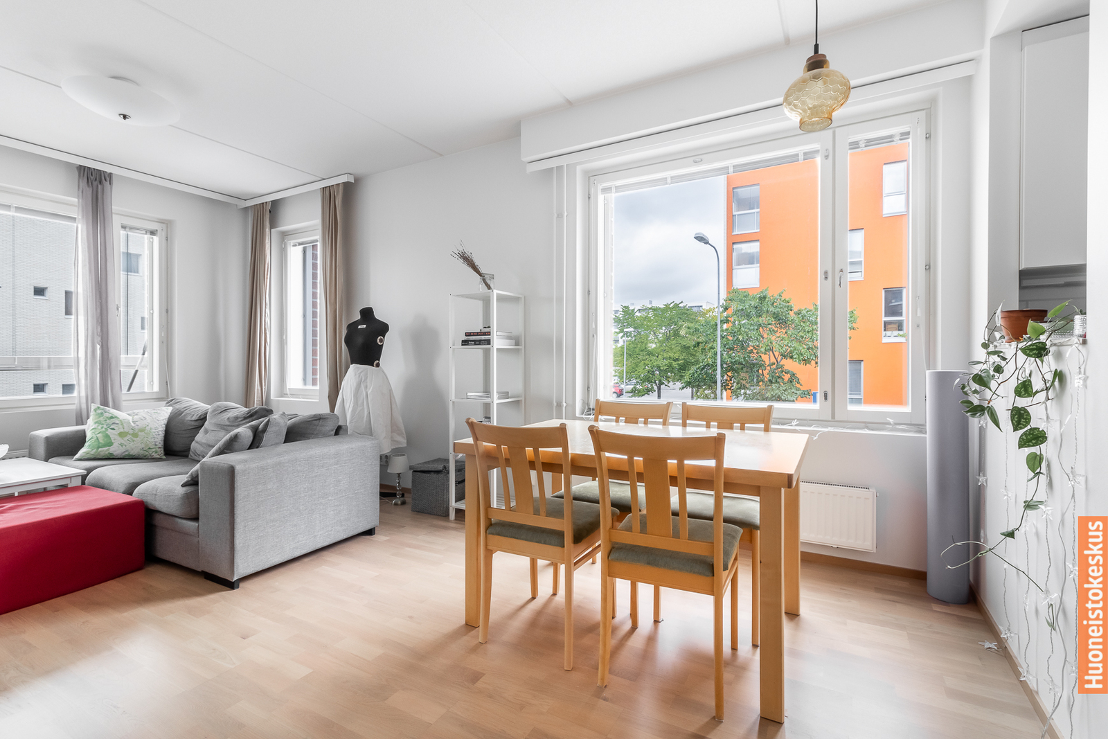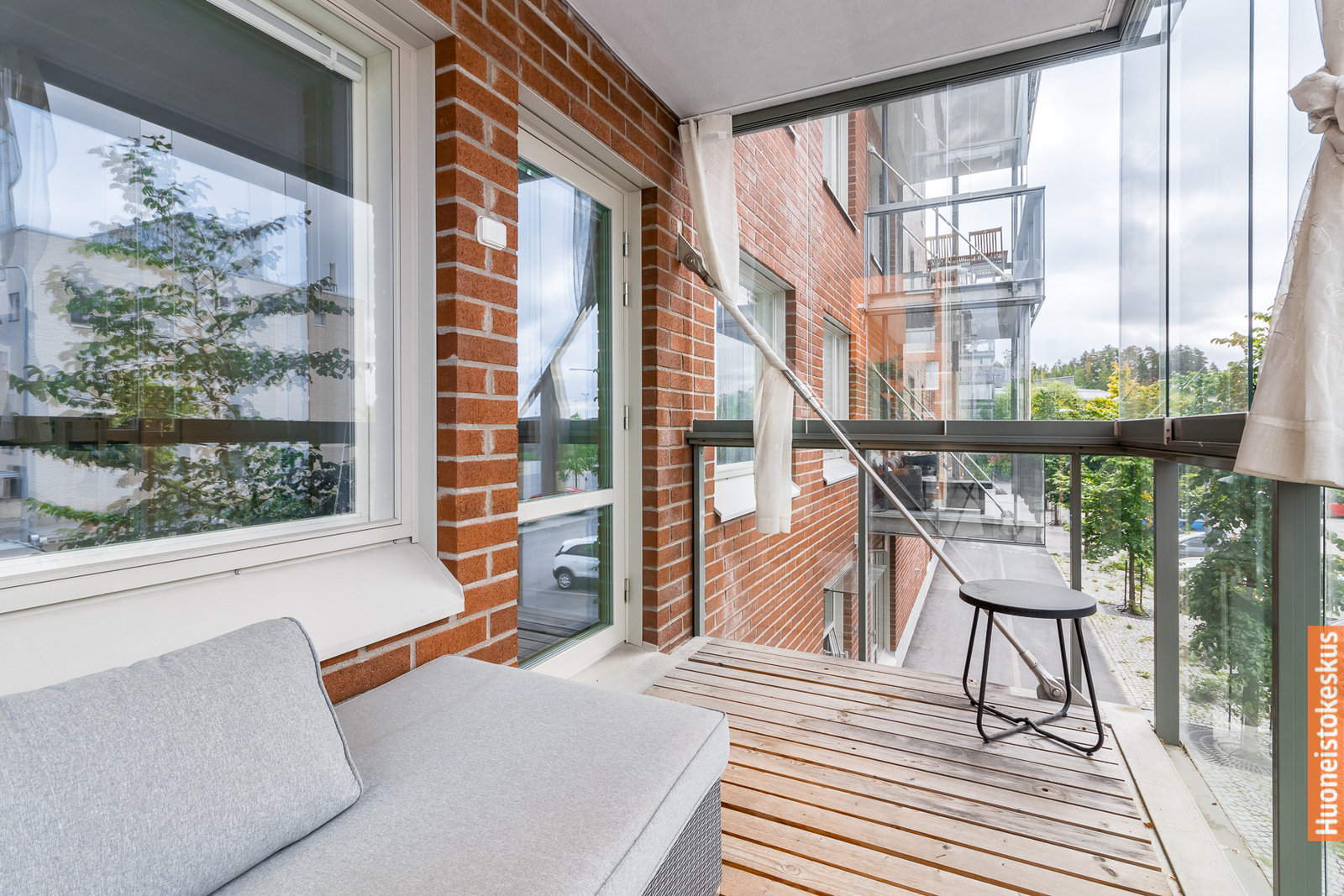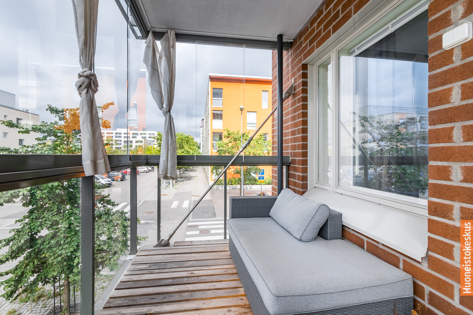 Tässä valoisassa asunnossa on tyylikäs avokeittiö ja olohuone, makuuhuone, tilava kylpyhuone ja sauna. Lasitetulla parvekkeella on tilaa parvekekalusteille.