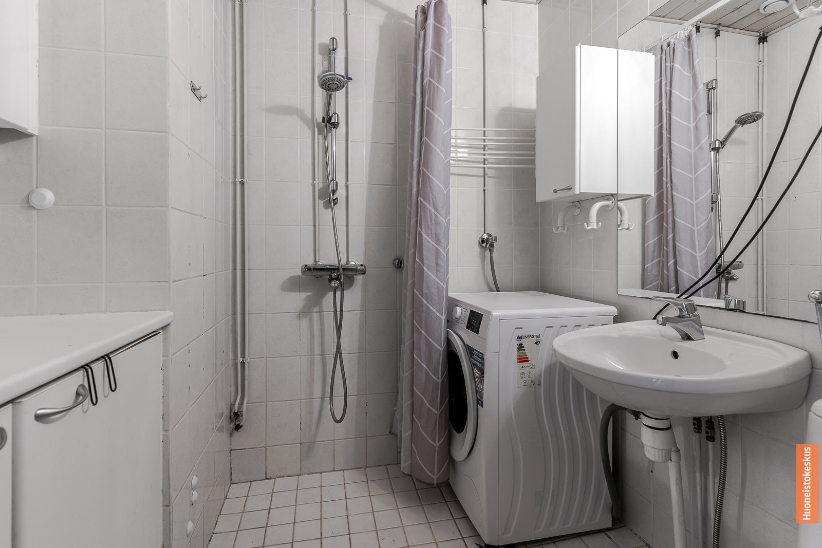 | Kylpyhuoneen kuvaus | Pesukoneliitäntä, wc-istuin, suihku, allaskaappi ja peili, seinät (kaakeli), lattiat (laatta) |