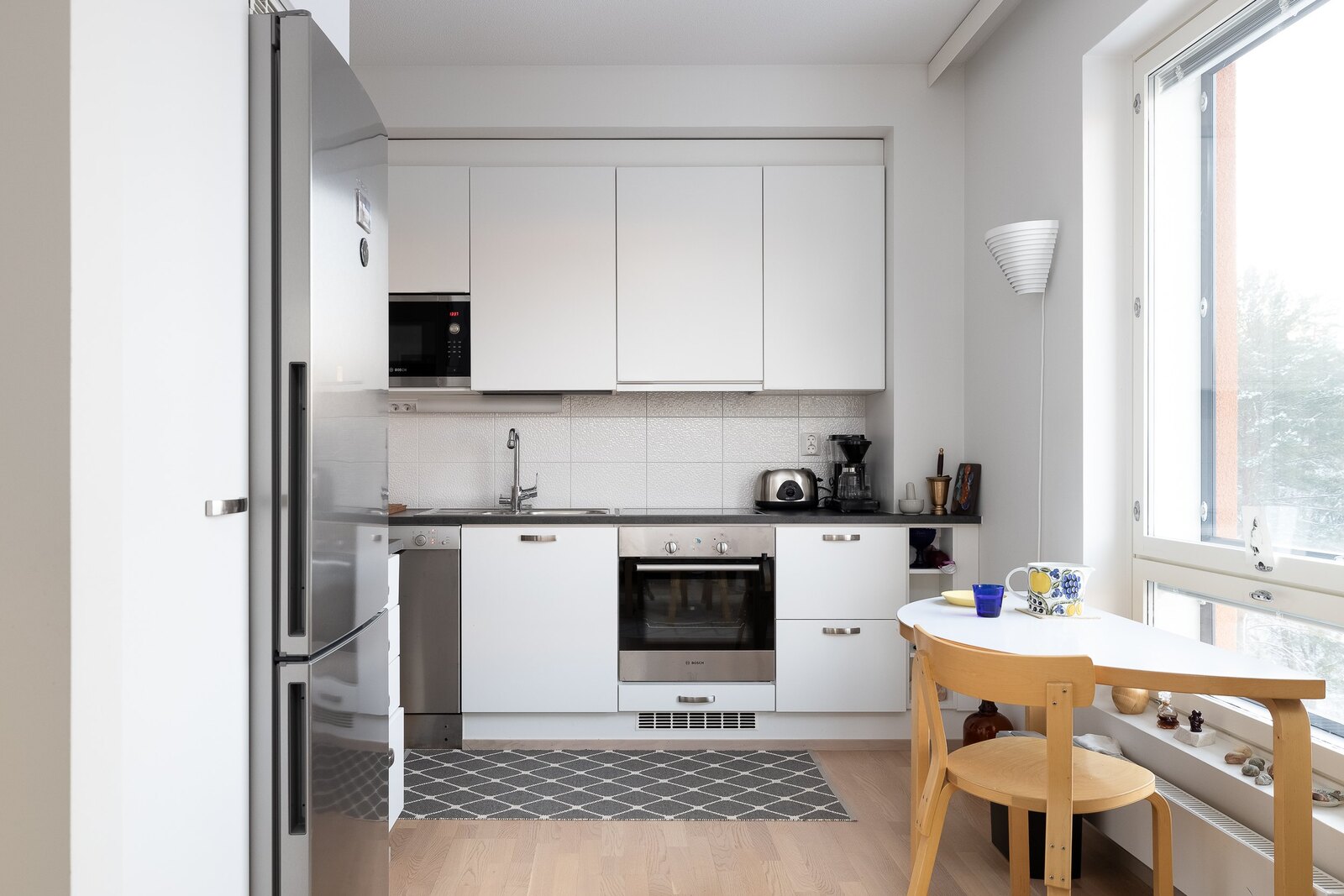 | Keittiön kuvaus | Liesi (Induktioliesi ja erillisuuni), seinät (maali), lattiat (parketti), astianpesukone, jääkaappipakastin, liesituuletin, erillisuuni ja liesi |