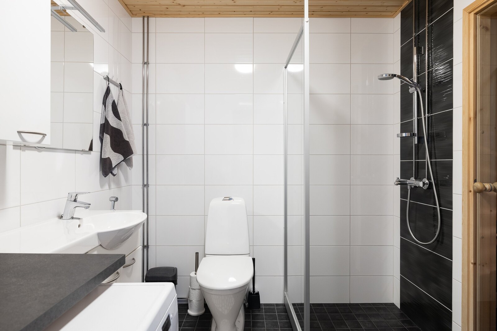 | Kylpyhuoneen kuvaus | Suihkuseinä, allaskaappi, pesukoneliitäntä, lattialämmitys, peilikaappi, wc-istuin, suihku ja kiinteät valaisimet, seinät (kaakeli), lattiat (laatta) |