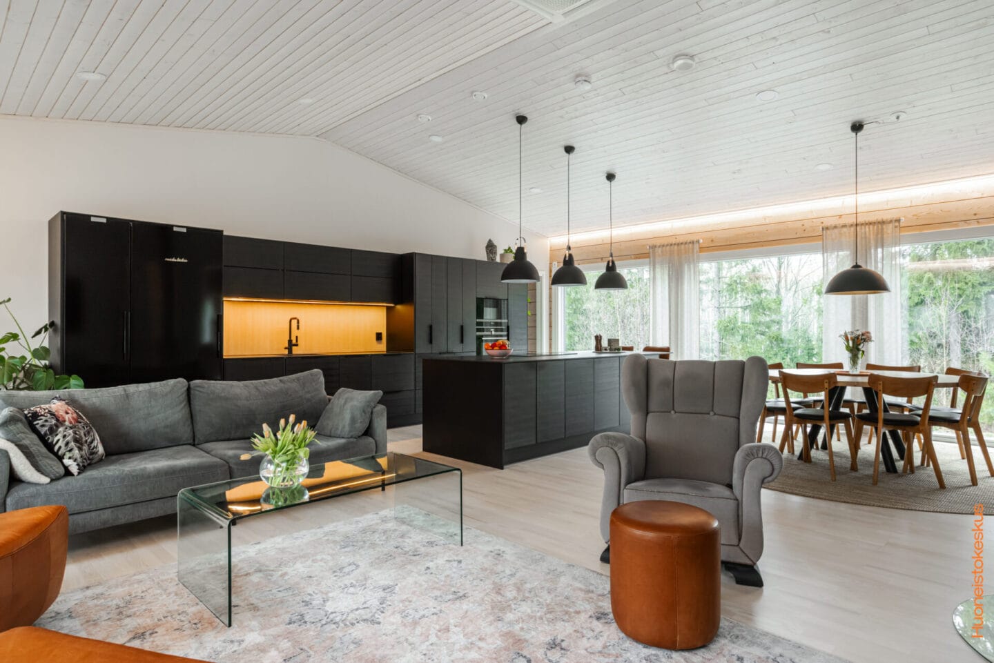Kodin sydän on henkeäsalpaava olohuoneen ja keittiön yhtenäinen tila. Korkea huonekorkeus, vaalea puupinta ja suuret ikkunat molemmin puolin luovat ainutlaatuisen tunnelman – kuin asuisit keskellä luontoa, vuodenajat suoraan osana arkea. Valo ja rauha leikkivät tilassa kauniisti, tehden jokaisesta päivästä hieman erityisemmän.