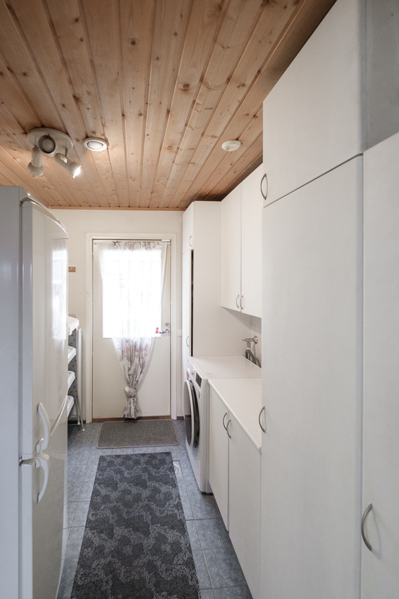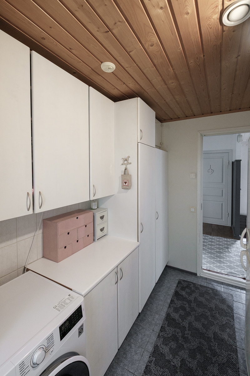 | Kodinhoitohuoneen kuvaus | Pesukoneliitäntä, pyykkikaapit ja pöytätaso, lattiat (laatta), seinät (maali) |