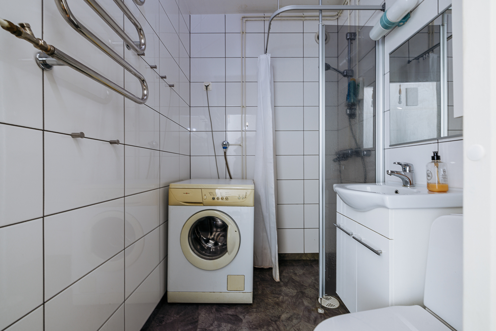 | Kylpyhuoneen kuvaus | Peili, suihkuseinä, suihku, wc-istuin, pesukoneliitäntä ja kiinteät valaisimet, seinät (kaakeli), lattiat (muovimatto) |
