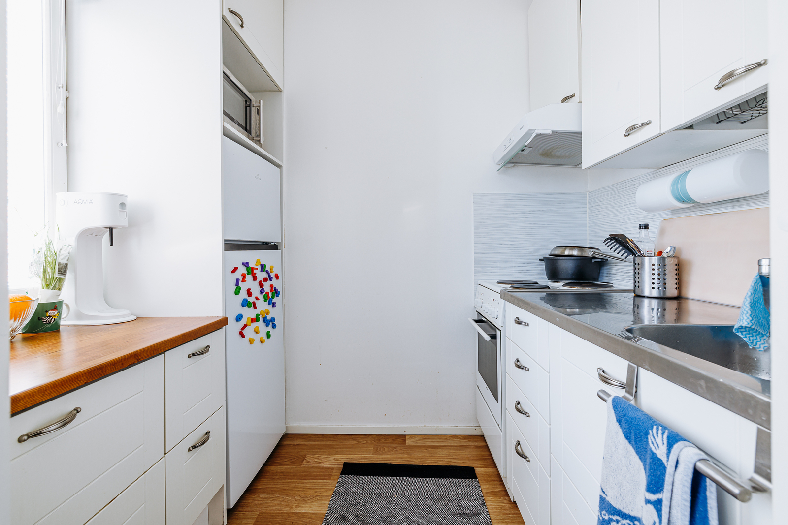 | Keittiön kuvaus | Liesi (sähköliesi), työtasot (laminaatti), seinät (maali), lattiat (muovimatto), liesi, liesituuletin, jenkkikaappi ja kiinteät valaisimet |