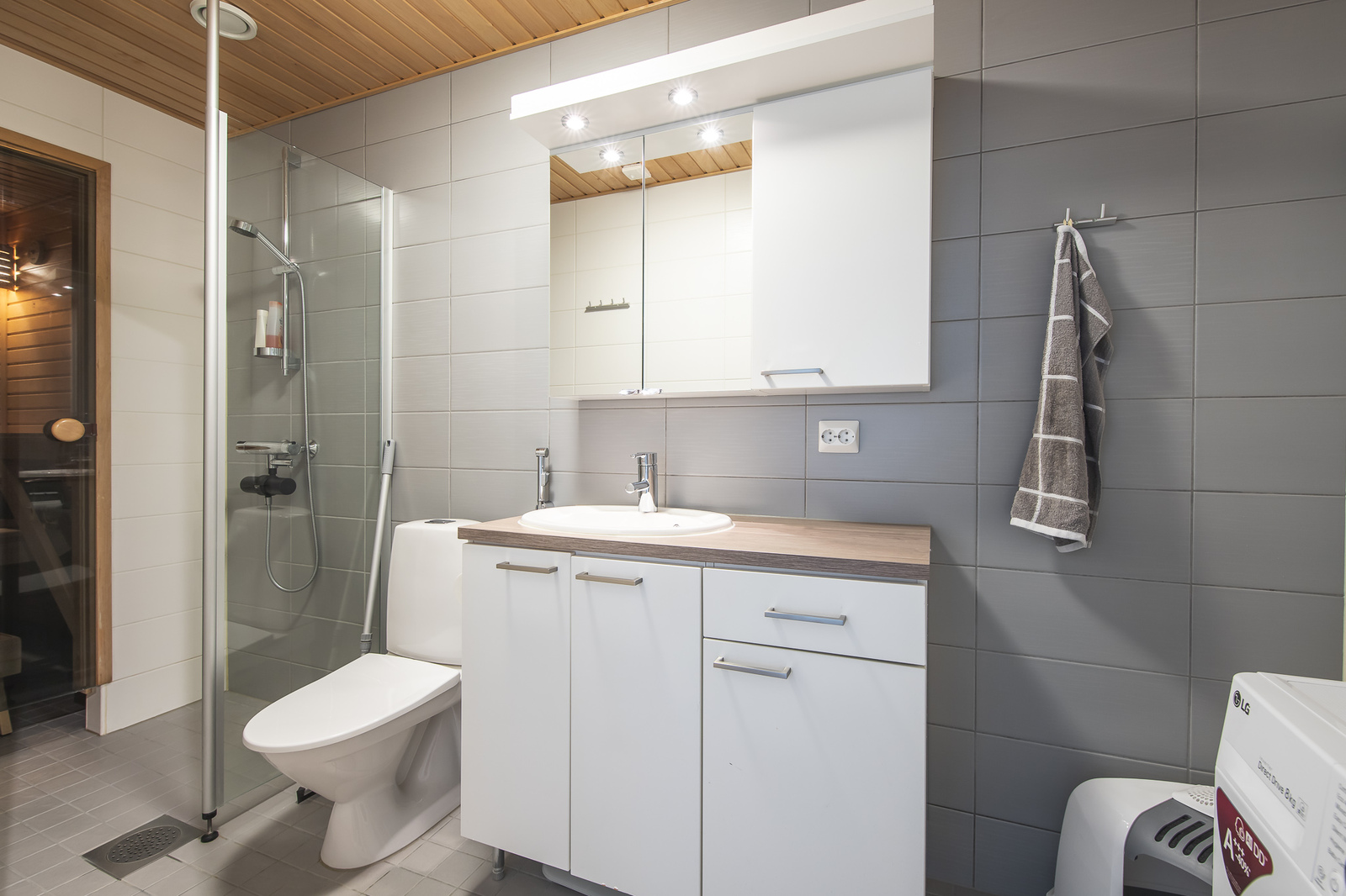 Peilikaappi, suihkuseinä, suihku, wc-istuin, allaskaappi ja pesukoneliitäntä, seinät (kaakeli), lattiat (laatta) |