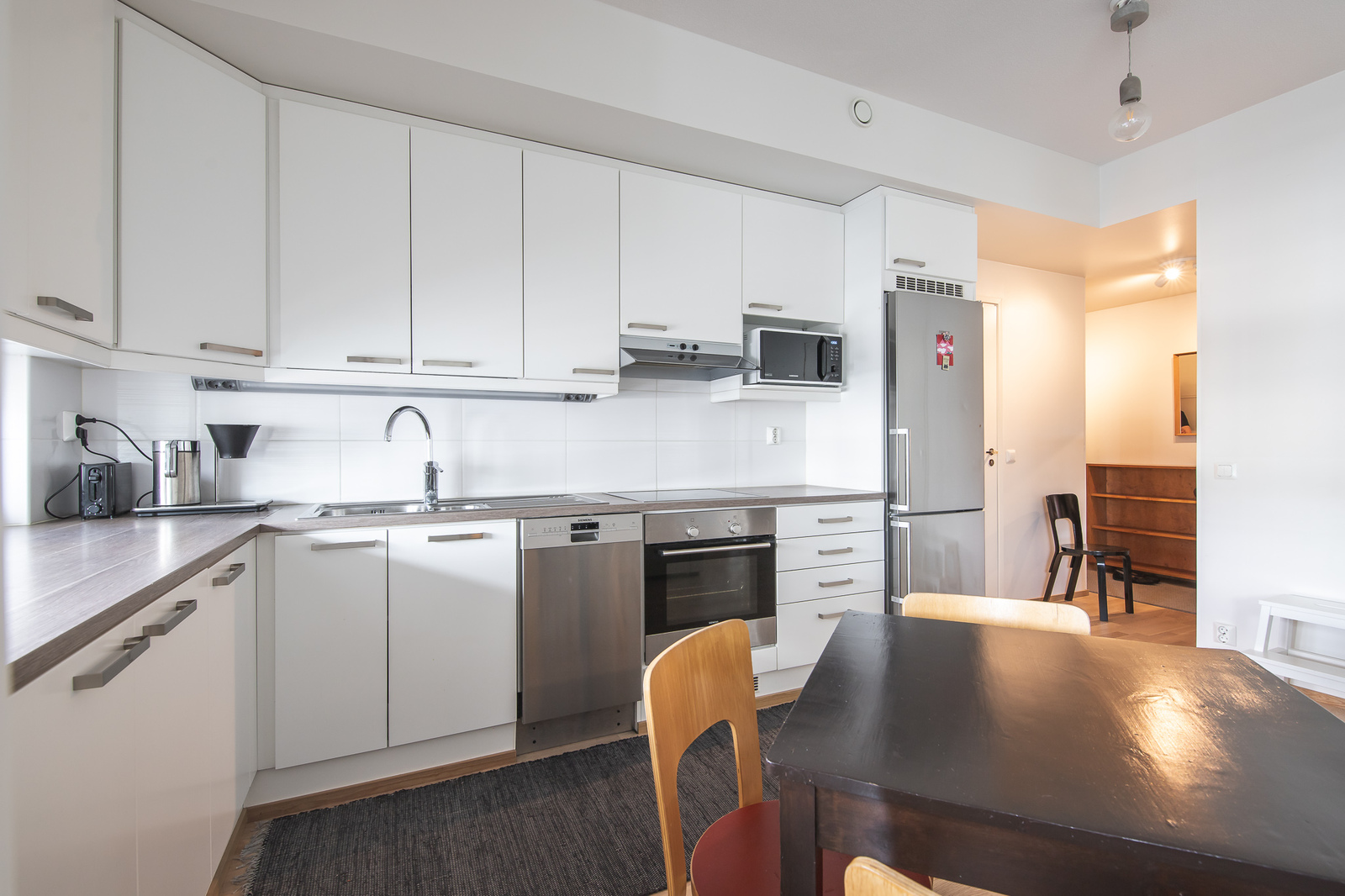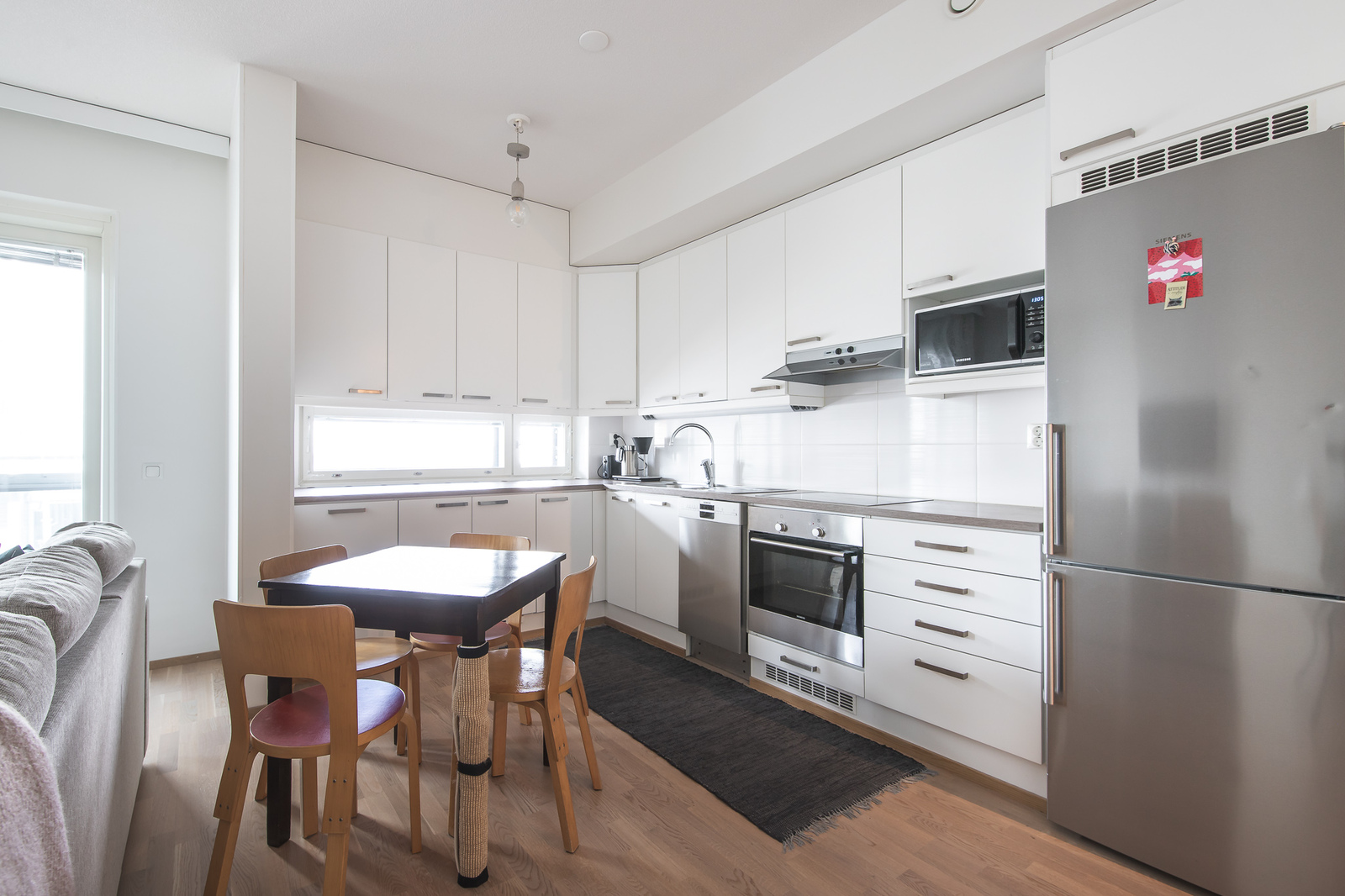 Liesi (Keraaminen liesi ja erillisuuni), työtasot (laminaatti), seinät (maali), astianpesukone, jääkaappipakastin, liesituuletin ja erillisuuni |