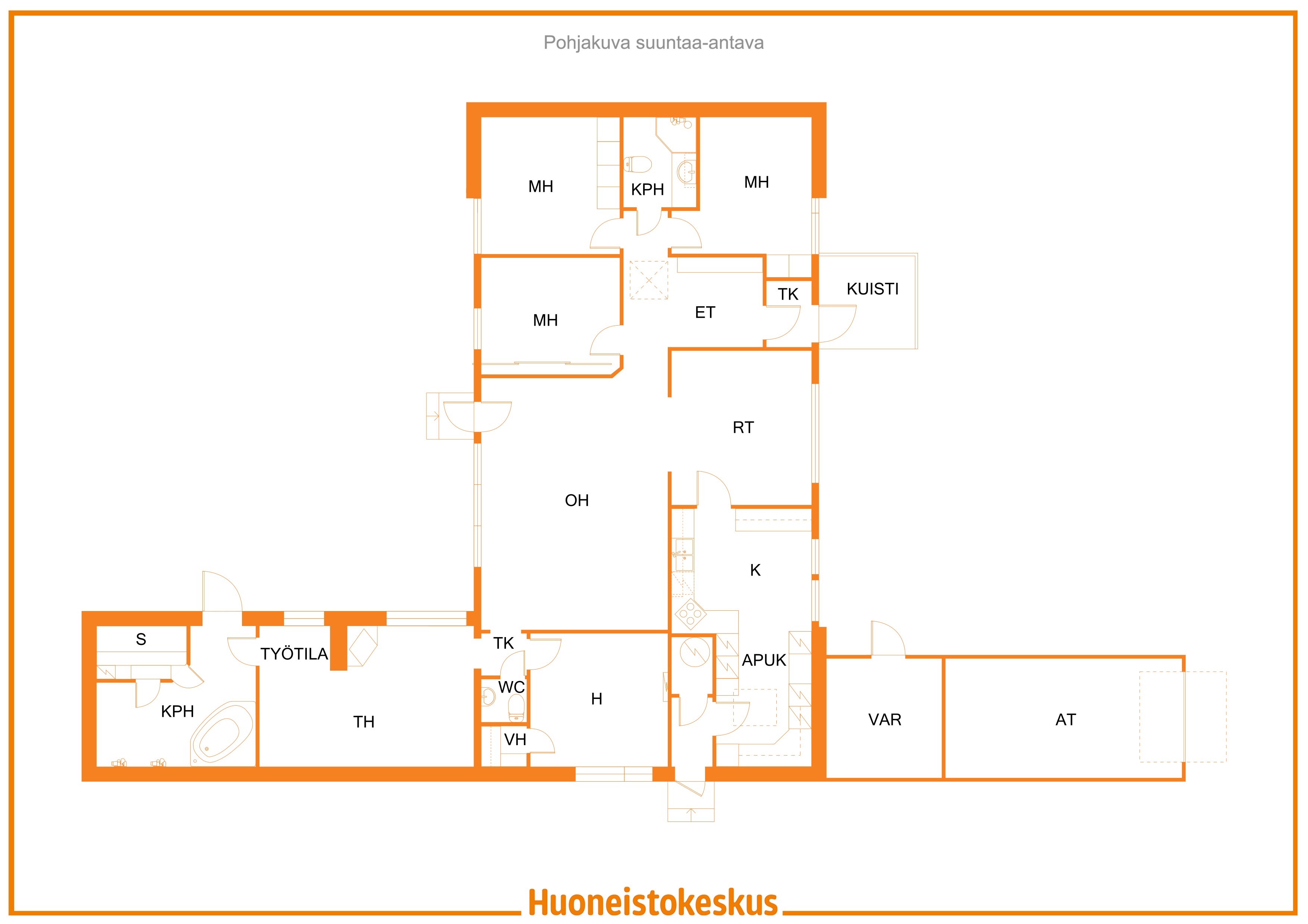 Olohuone, ruokailuhuone, neljä makuuhuonetta, keittiö, kodinhoitohuone, takkahuone, sauna, pesuhuone, kylpyhuone, wc, vaatehuone, varasto ja autotalli. |