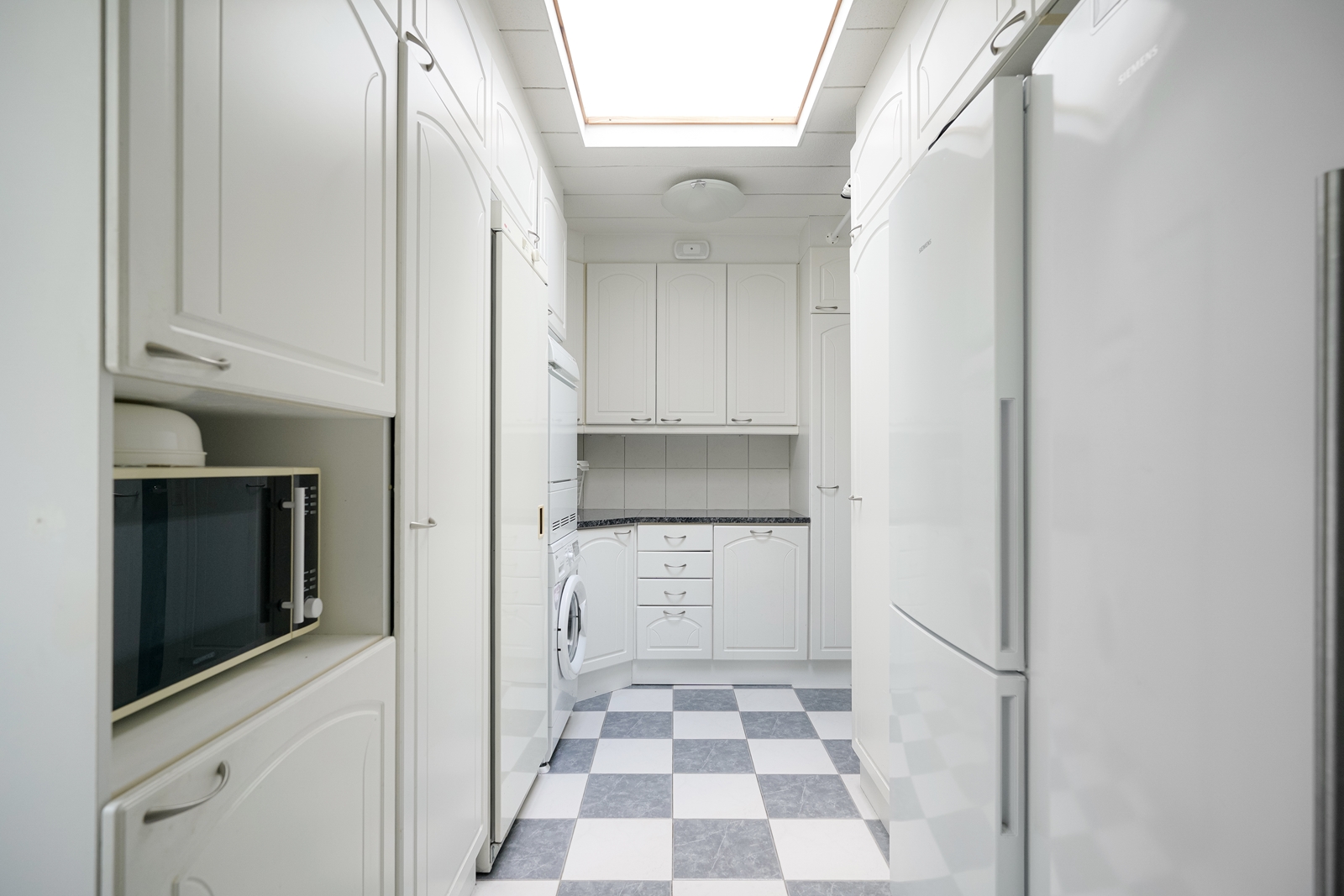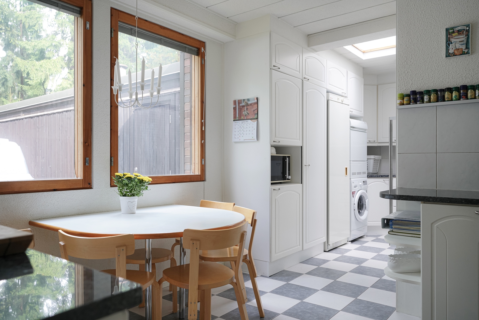 Pesukoneliitäntä, kurapiste ja tila pesutornille, lattiat (laatta), seinät (maali), Kodinhoitohuone (apukeittiö) on keittiön yhteydessä. Kodinhoitohuoneesta on käynti ulos. |