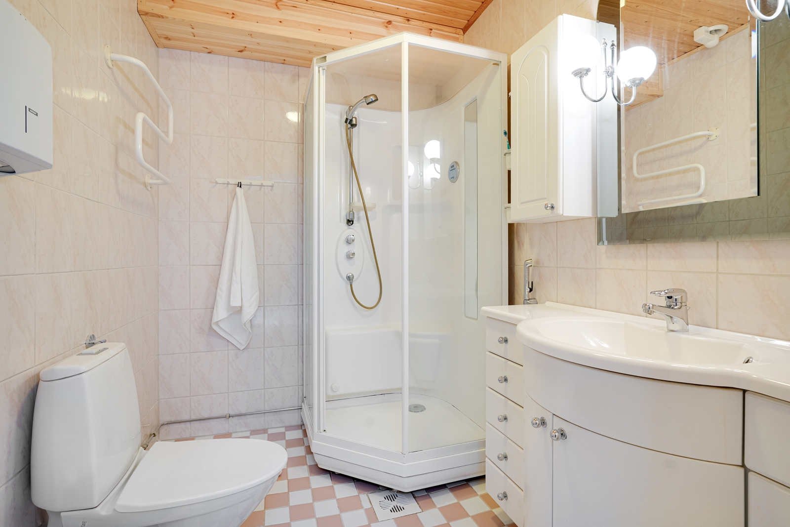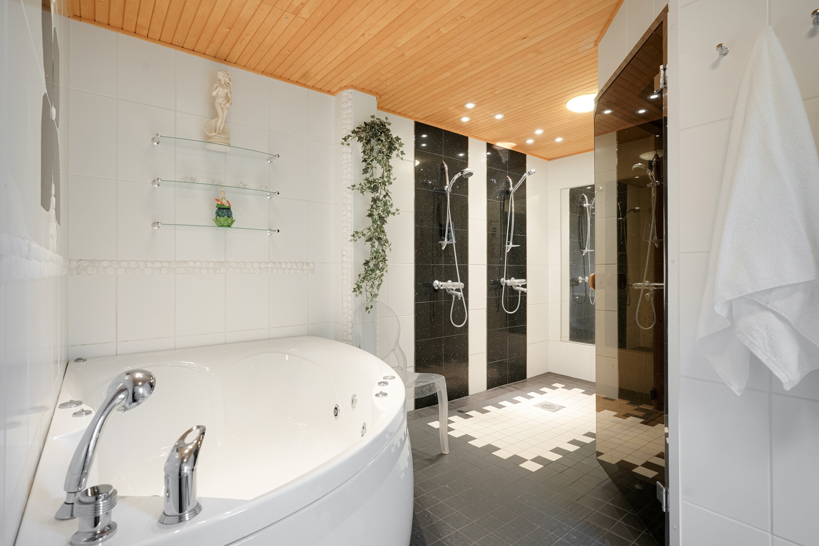 Pesukoneliitäntä (Kodinhoitotila), wc-istuin, suihku, suihkukaappi, poreamme, lattialämmitys, pesuallas ja allaskaappi, seinät (kaakeli), lattiat (laatta) |