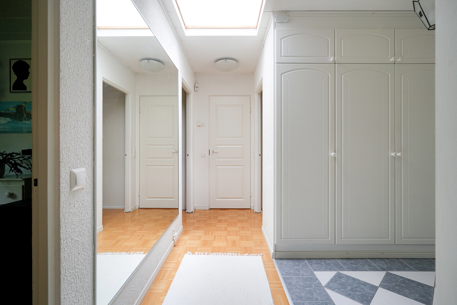 Kylmä ulkovarasto, seinäkaapit ja vaatehuone |