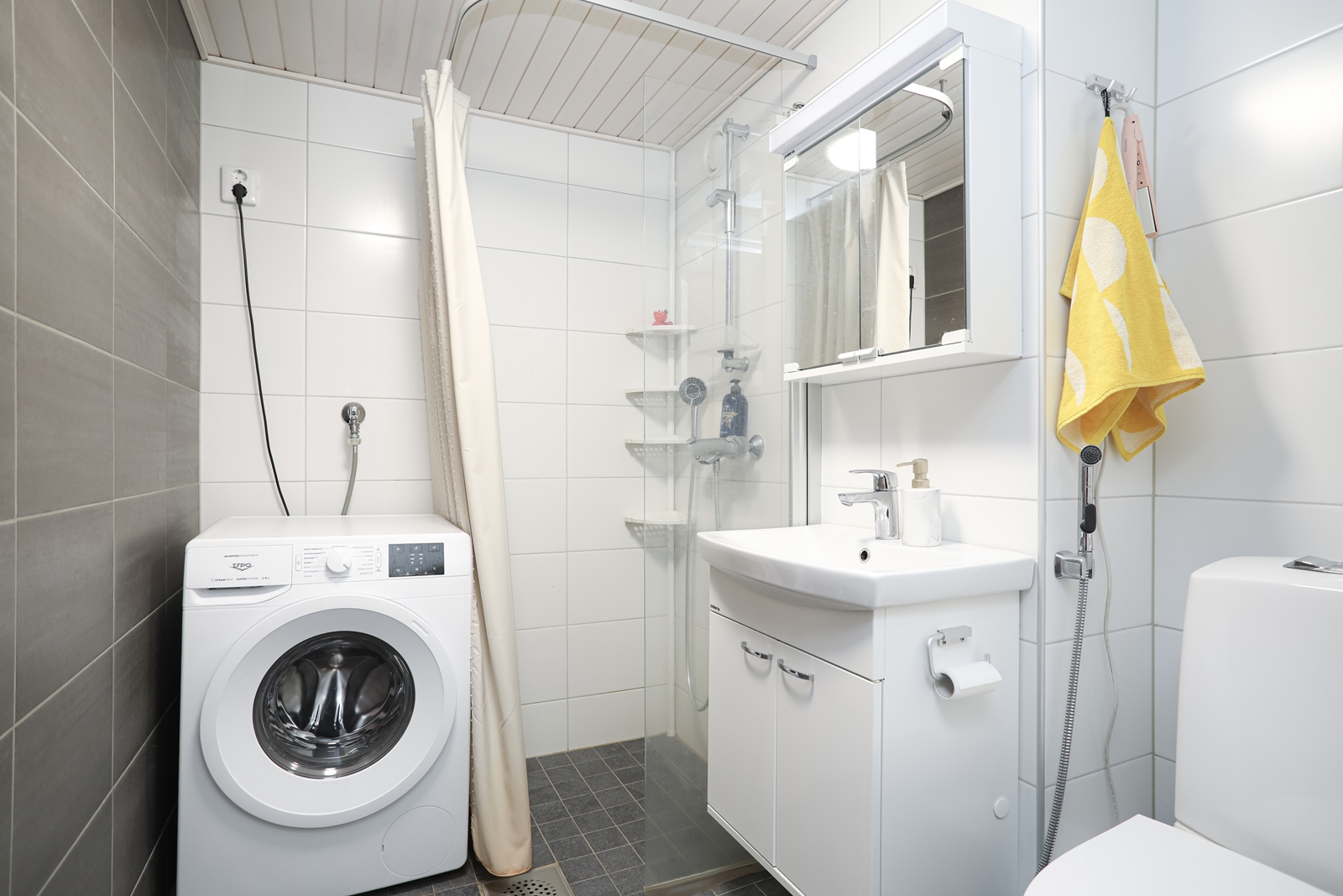 | Kylpyhuoneen kuvaus | WC-istuin, suihku, pesukoneliitäntä, lattialämmitys, peilikaappi, pesuallas ja bidee-suihku, seinät (kaakeli), lattiat (laatta), Peruskorjattu kokonaisuudessaan v.2023 linjasaneerauksen yhteydessä. |