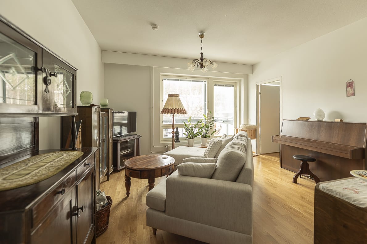 Tämä näppärä kaksio sijaitsee toisessa kerroksessa ja sen ikkunat katsovat rauhallisen sivukadun puolelle. Olohuone yhdistyy toimivasti keittiöön, jossa on reilusti kaappi- ja laskutilaa huoneiston neliöihin nähden. Lasitetulla parvekkeella voit nauttia kahvit ilta-auringossa tai vilvoitella saunan jälkeen.