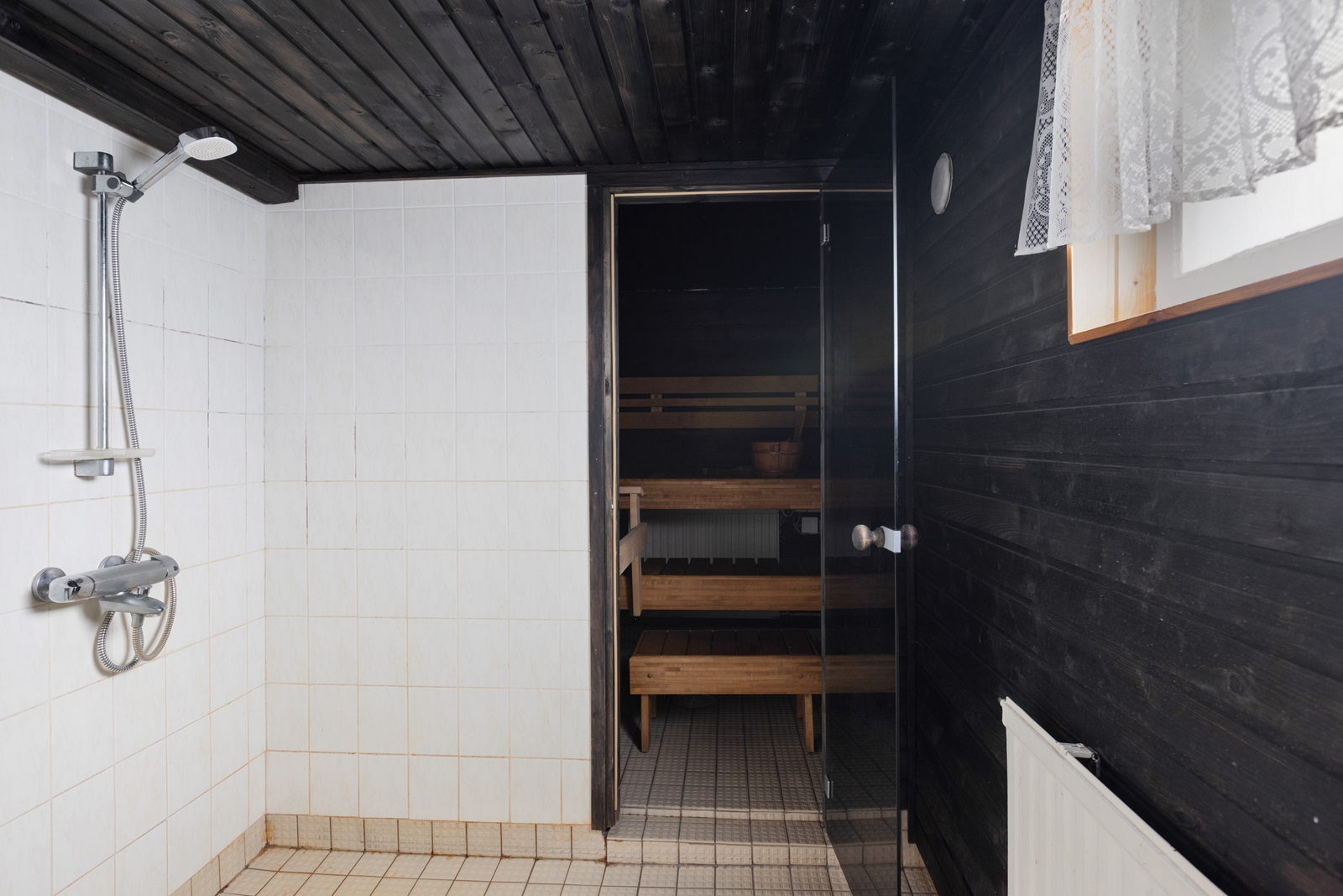 | Saunan kuvaus | Seinät (paneeli), lattiat (laatta), Sähkökiuas |