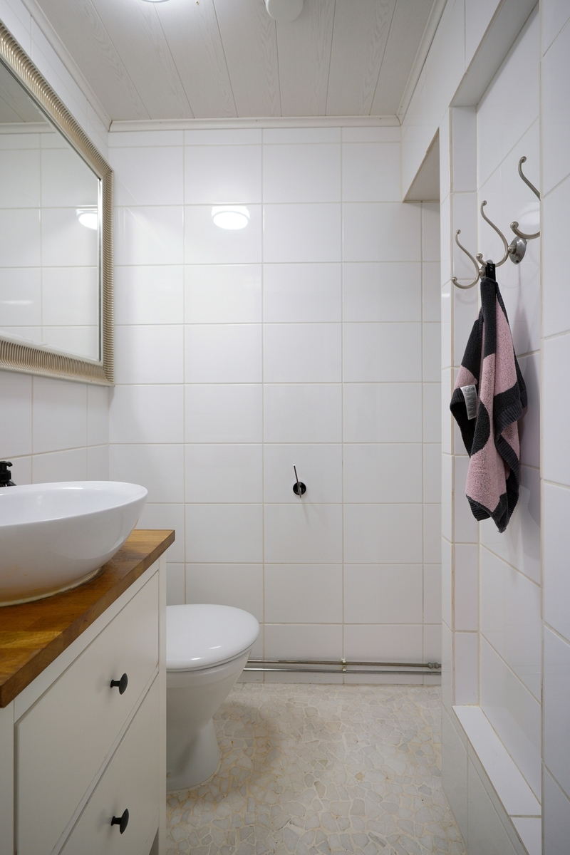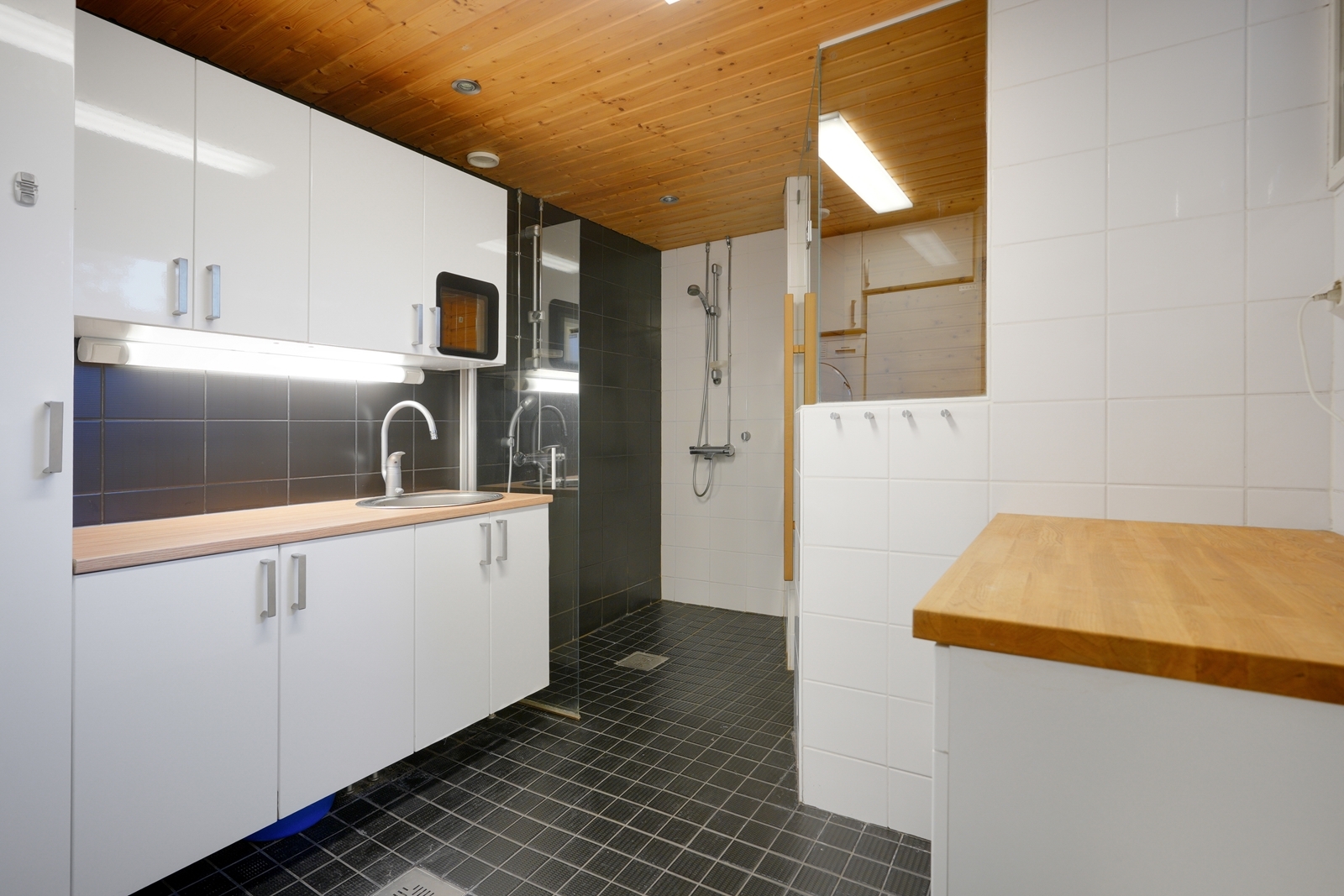 | Kylpyhuoneen kuvaus | Lattialämmitys, allaskaappi, suihkuseinä, pesukoneliitäntä, suihku ja kiinteät valaisimet, seinät (kaakeli), lattiat (laatta) |