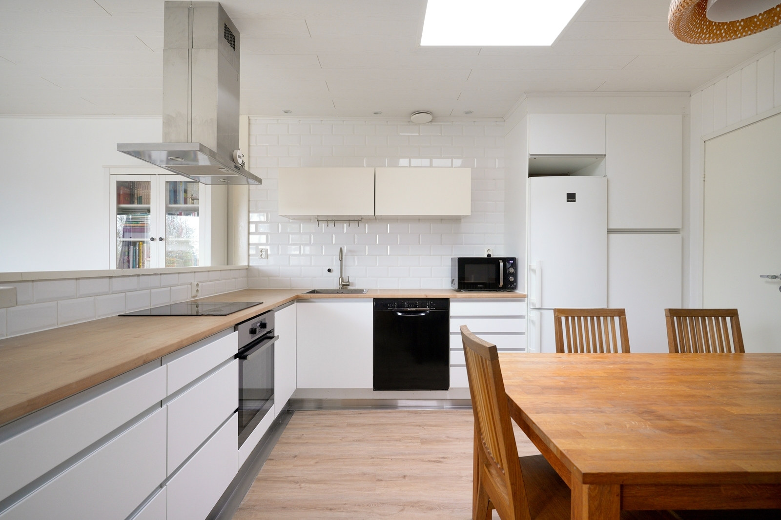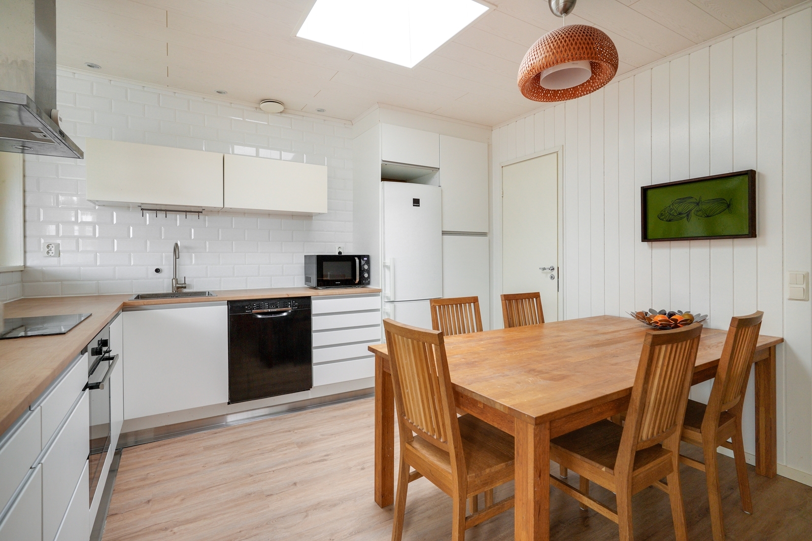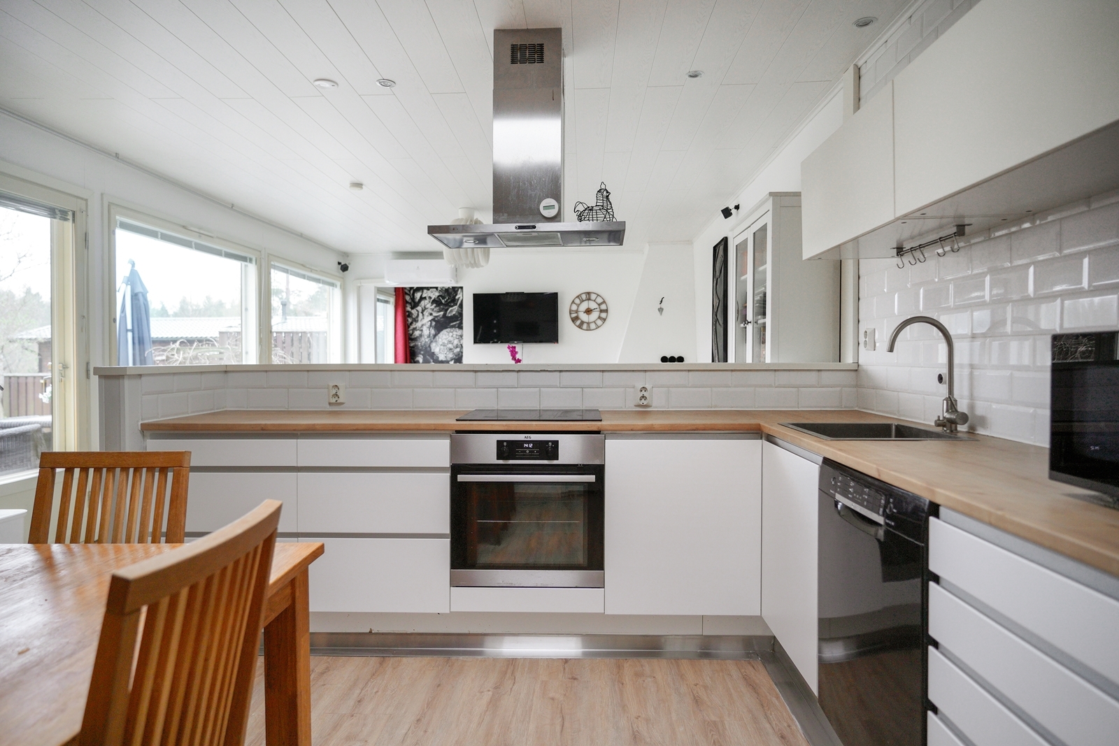| Keittiön kuvaus | Liesi (Induktioliesi ja erillisuuni), työtasot (laminaatti), seinät (maali), lattiat (vinyyli), liesi, jääkaappipakastin, astianpesukone, erillisuuni ja kiinteät valaisimet, liesituuletin / hormi |