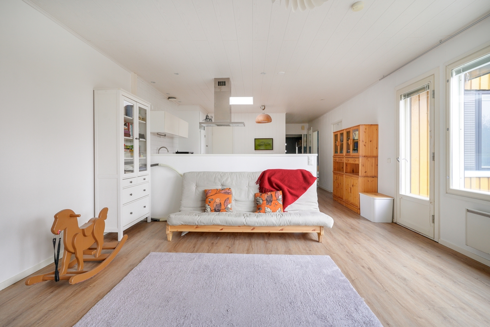 Tervetuloa tutustumaan tähän yksitasoiseen, hyvin suunniteltuun paritaloon, jossa arki sujuu kuin itsestään! Kodin sydän on tilava ja valoisa olohuone, jonka tunnelmaa korostaa kaunis takka. Avoin keittiö yhdistyy saumattomasti oleskelutilaan, luoden täydellisen paikan yhdessäoloon ja illanistujaisiin.