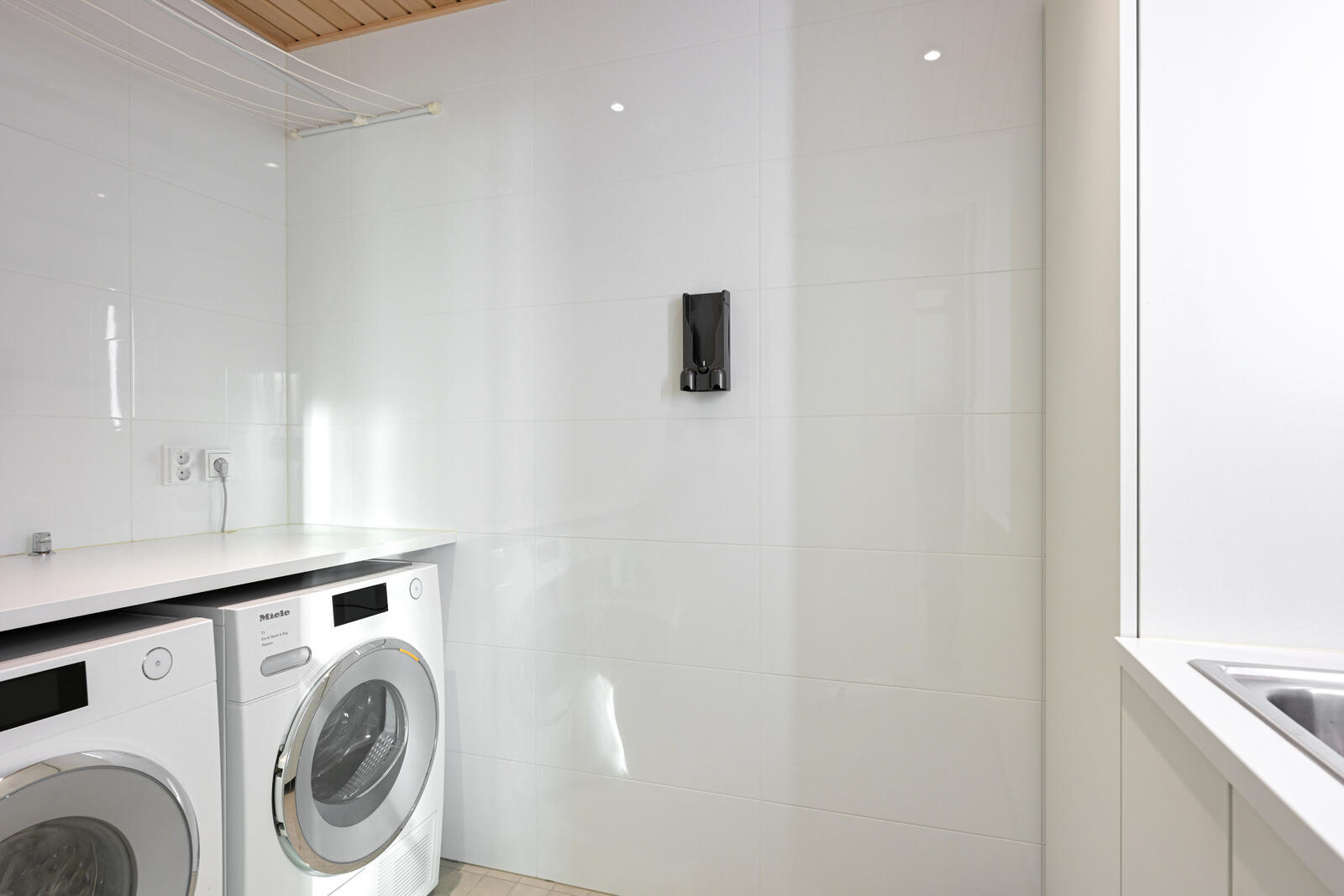 Kokonaan laatoitetussa kodinhoitohuoneessa tason alla Mielen pyykinpesukone ja kuivausrumpu, pyykkikaappi, pesuallas ja allaskaapisto, lattiakaivo. |
