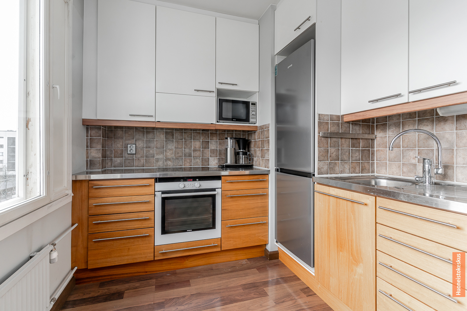 | Keittiön kuvaus | Liesi (Induktioliesi), työtasot (teräs), seinät (kaakeli), jääkaappipakastin, erillisuuni, astianpesukone ja mikroaaltouuni |