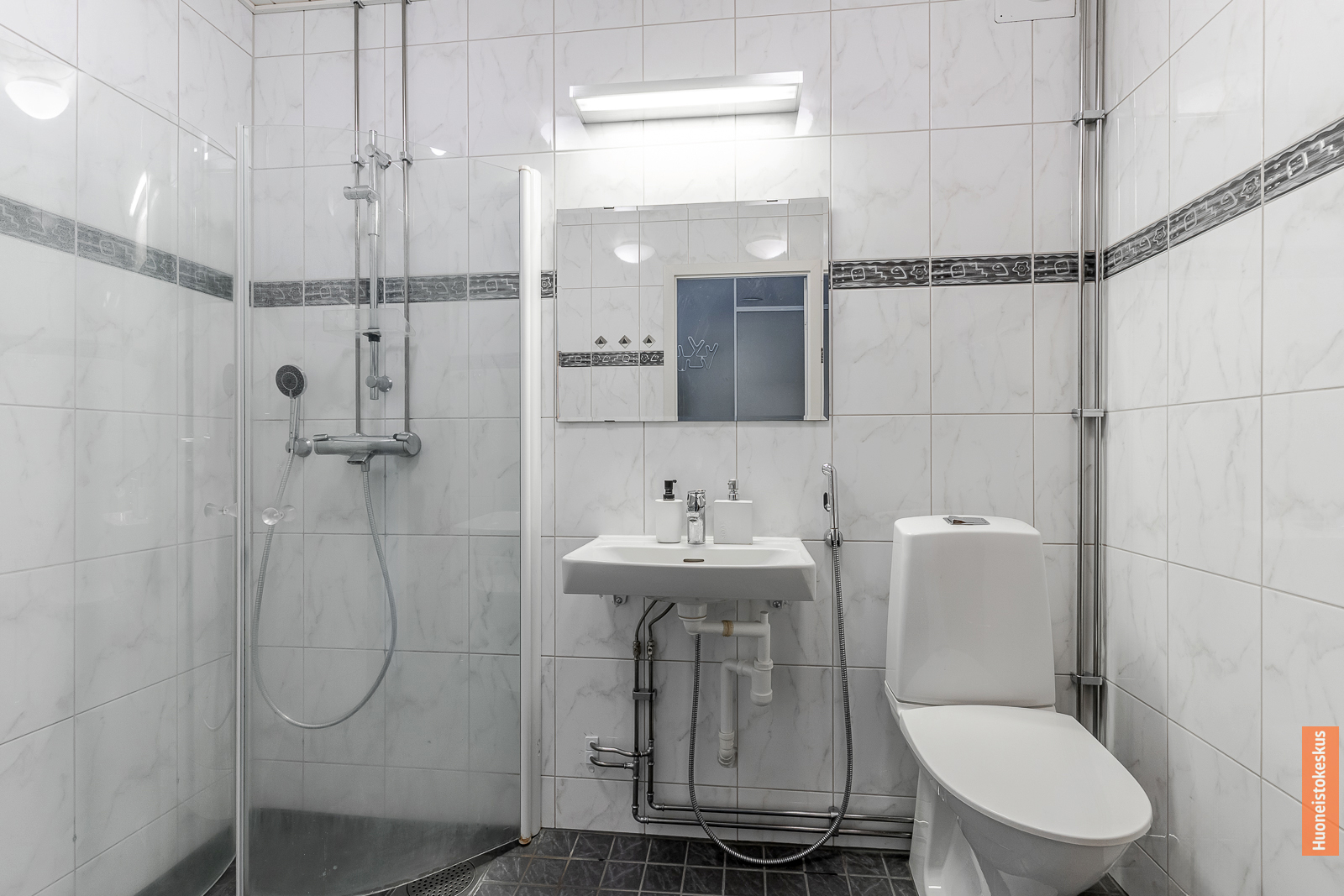 | Kylpyhuoneen kuvaus | WC-istuin, suihku, peilikaappi, pesukoneliitäntä ja allaskaappi, seinät (kaakeli), lattiat (laatta) |