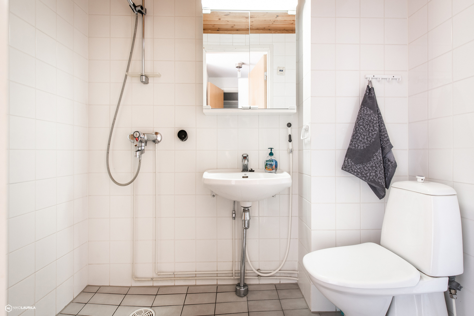 Suihku, pesukoneliitäntä, wc-istuin, peilikaappi ja pesukone, lattiat (laatta) |