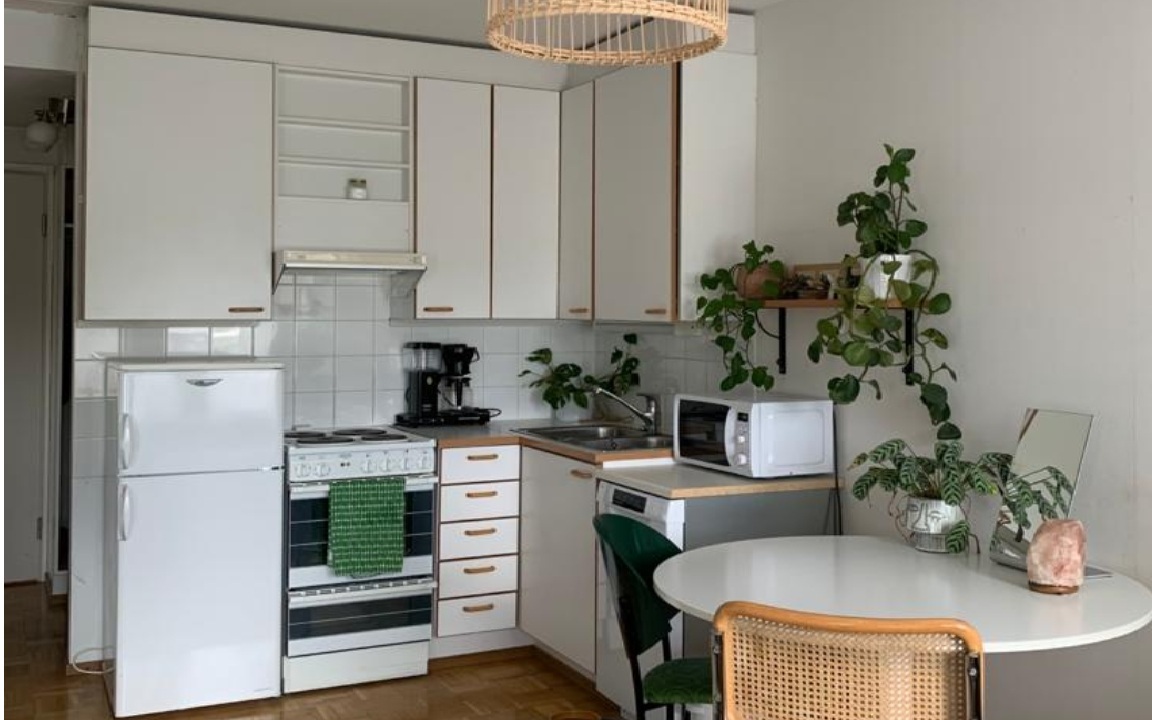 Liesi (sähköliesi), työtasot (laminaatti), seinät (maali), lattiat (parketti), jääkaappipakastin, liesi, liesituuletin ja astianpesukone |