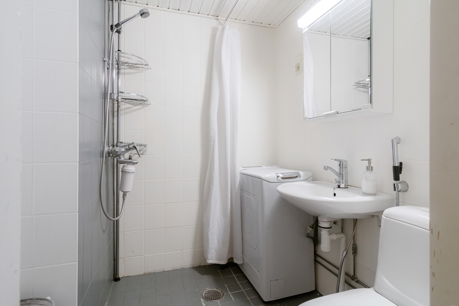 | Kylpyhuoneen kuvaus | WC-istuin, suihku, pesukoneliitäntä, bidee-suihku ja lattialämmitys, seinät (kaakeli), lattiat (laatta) |
