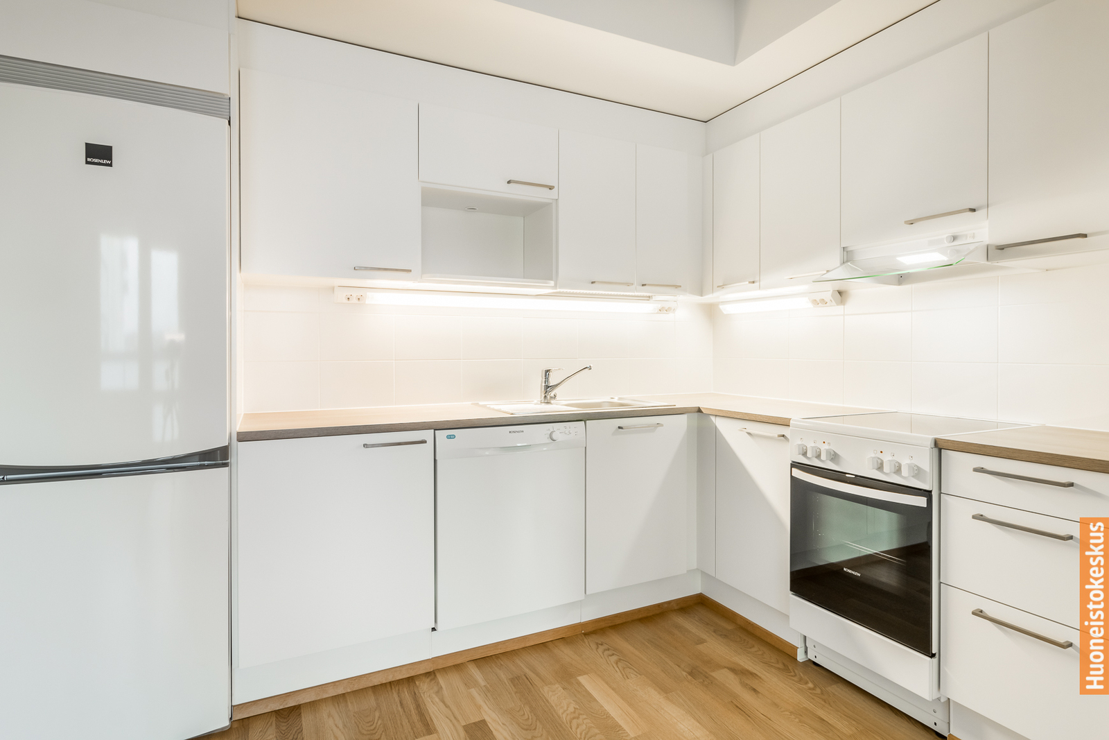 | Keittiön kuvaus | Liesi (Keraaminen liesi), työtasot (laminaatti), seinät (maali ja laatta), lattiat (laminaatti), liesituuletin ja jääkaappipakastin |