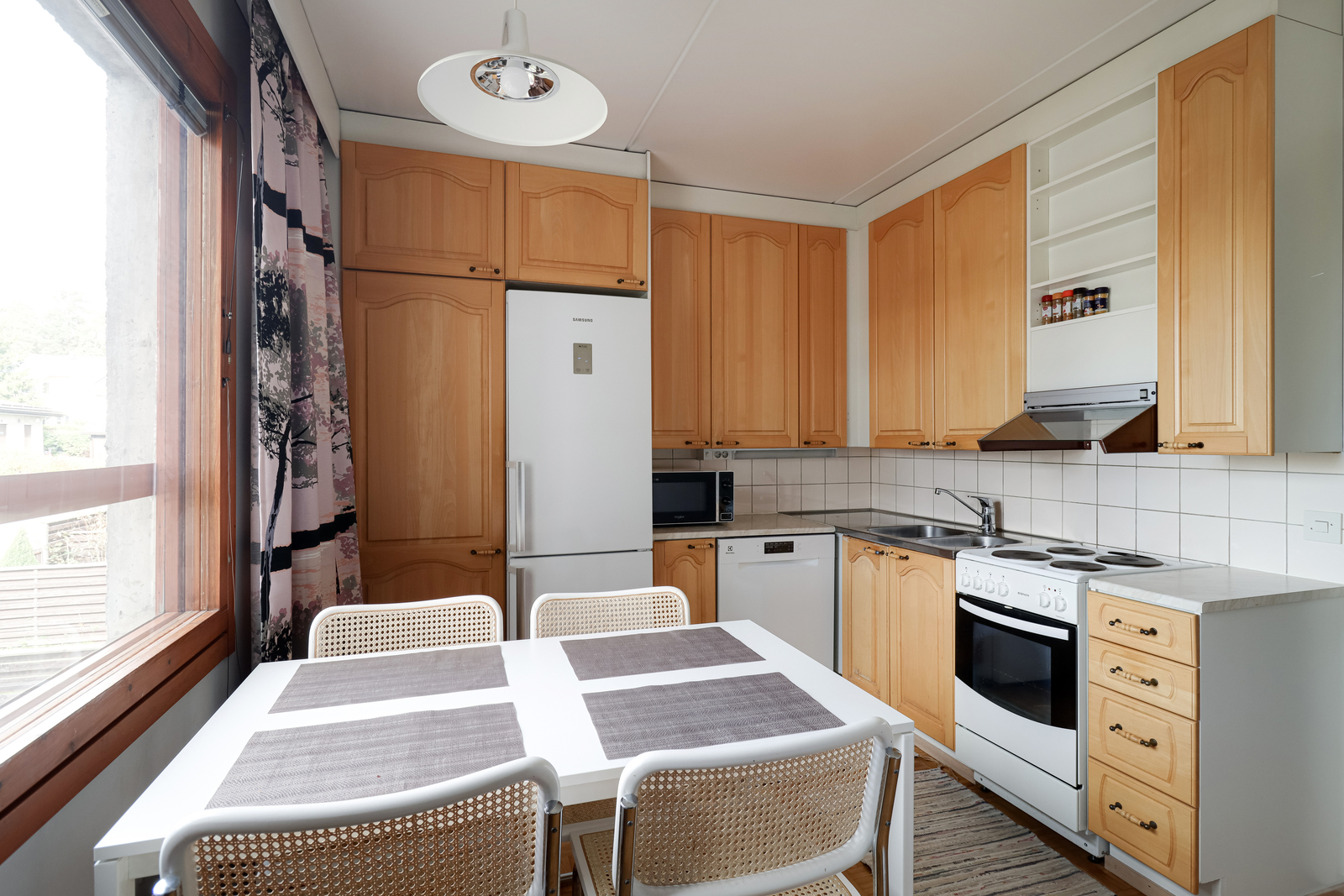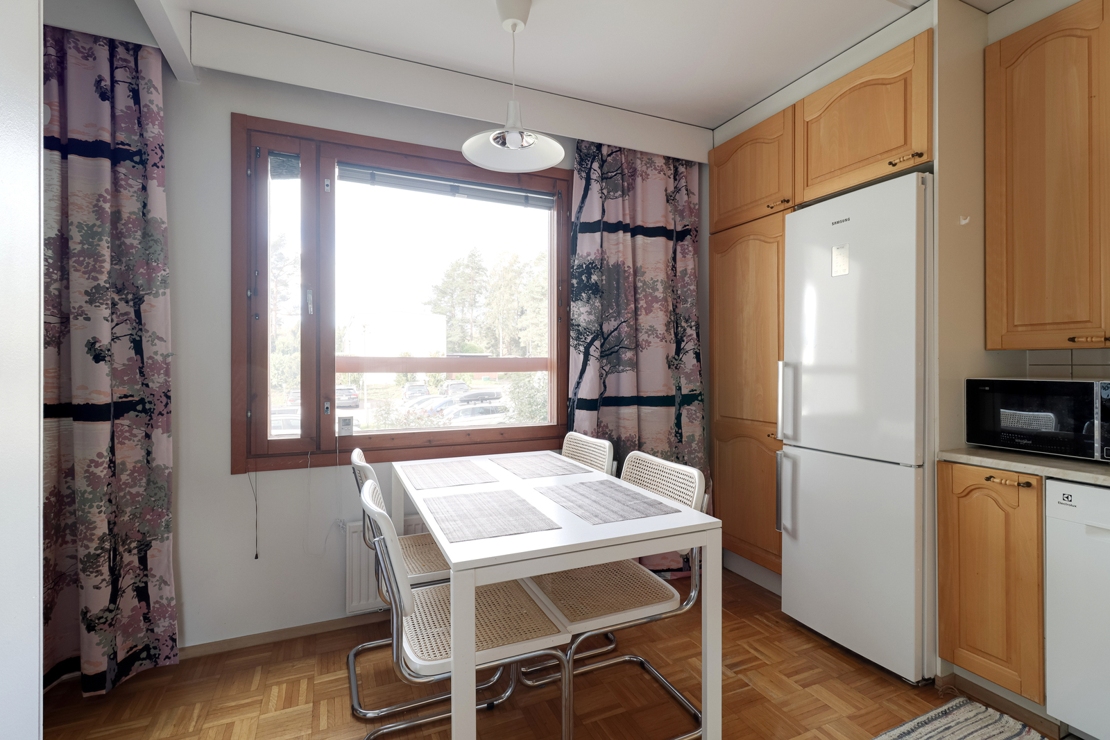 | Keittiön kuvaus | Liesi (sähköliesi), lattiat (parketti), jääkaappipakastin (v. 2019), astianpesukone (v. 2023), liesi, liesituuletin ja kiinteät valaisimet |