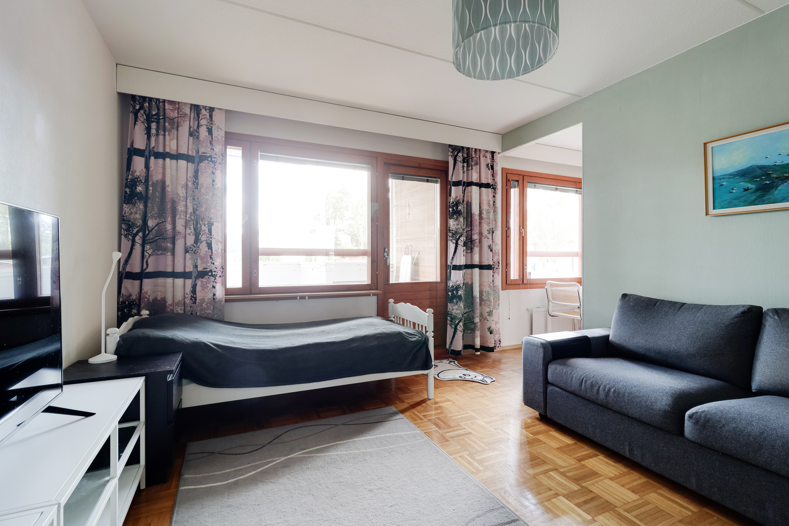 Keittiö on käytännöllisesti yhteydessä olohuoneeseen, mikä tekee arjesta sujuvaa ja kutsuu koko perheen viihtymään yhdessä. Kaksi tilavaa makuuhuonetta tarjoavat runsaasti tilaa asumiseen ja säilytykseen.