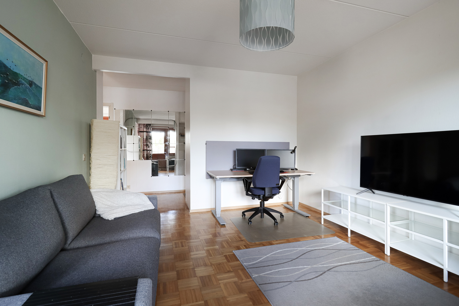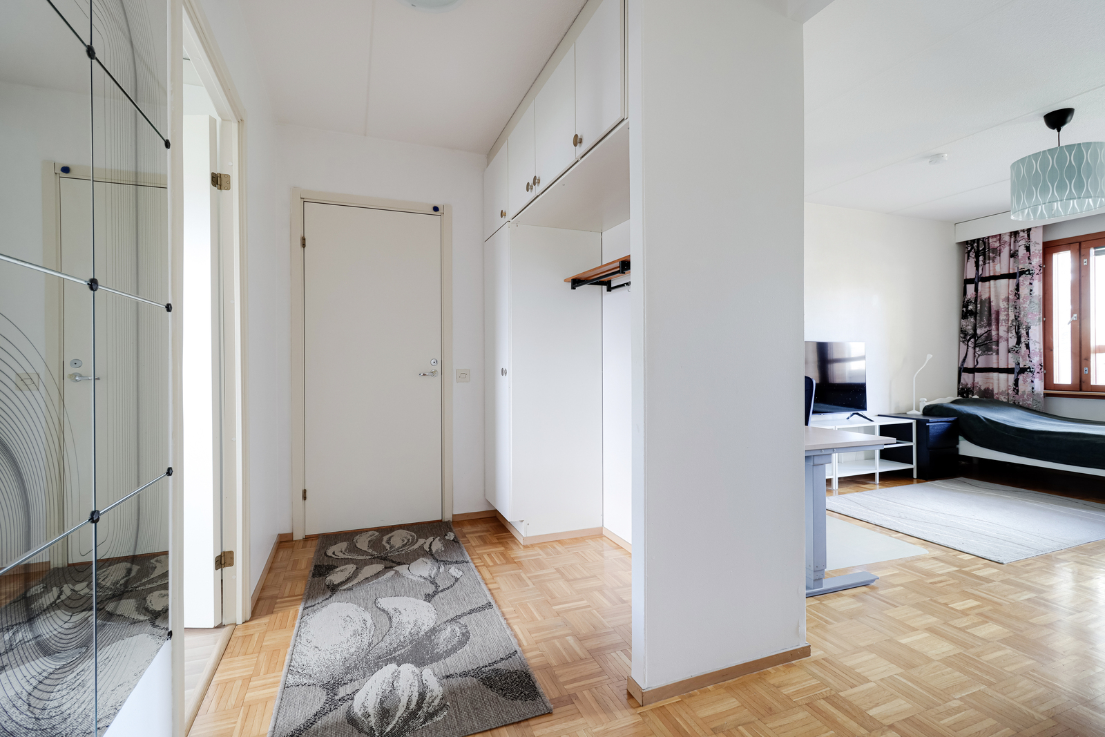Tämä viihtyisä koti toivottaa lämpimästi tervetulleeksi heti ovella. Suuri olohuone hurmaa avaruudellaan ja jatkuu lasitetulle länsiparvekkeelle, josta avautuvat kauniit näkymät rauhalliselle sisäpihalle.