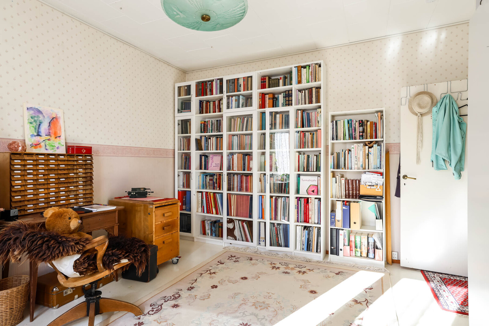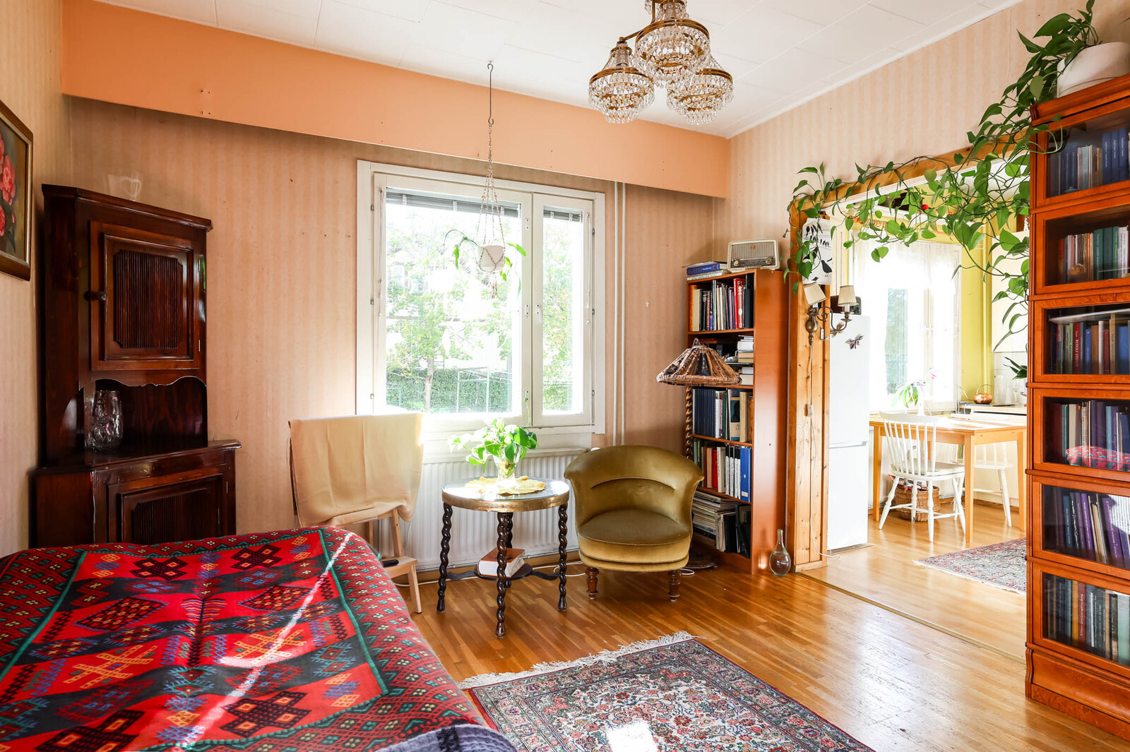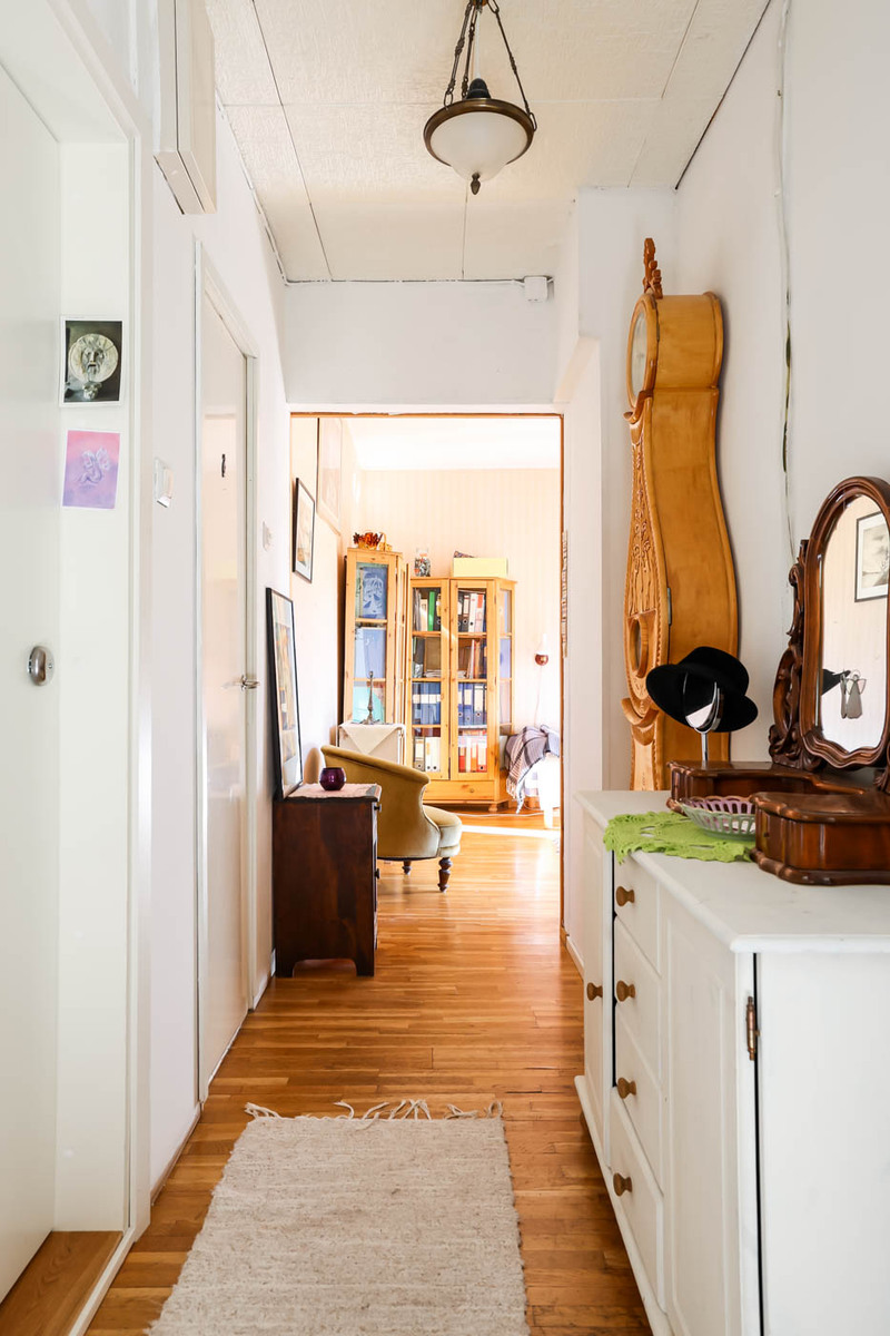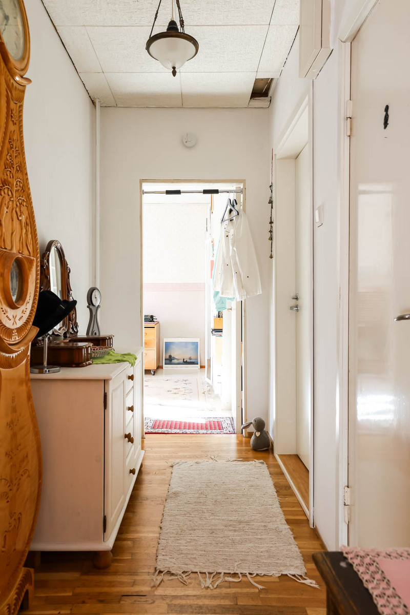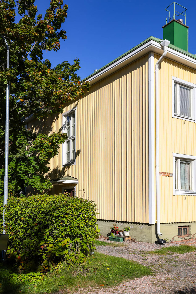 Ensimmäisen kerroksen 44 m²:n kaksio sijaitsee 1930-luvun puutaloyhtiössä, aivan puiston kupeessa. Pohjaratkaisu on selkeä: olohuone, erillinen keittiö, tilava kammari ja kylpyhuone. Asunnossa on nykyaikaisia mukavuuksia, mutta ei liian siloteltua: Keittiössä on varaus astianpesukoneelle. Kylpyhuone on uusittu LVIS-remontin yhteydessä ja varustettu lattialämmityksellä.