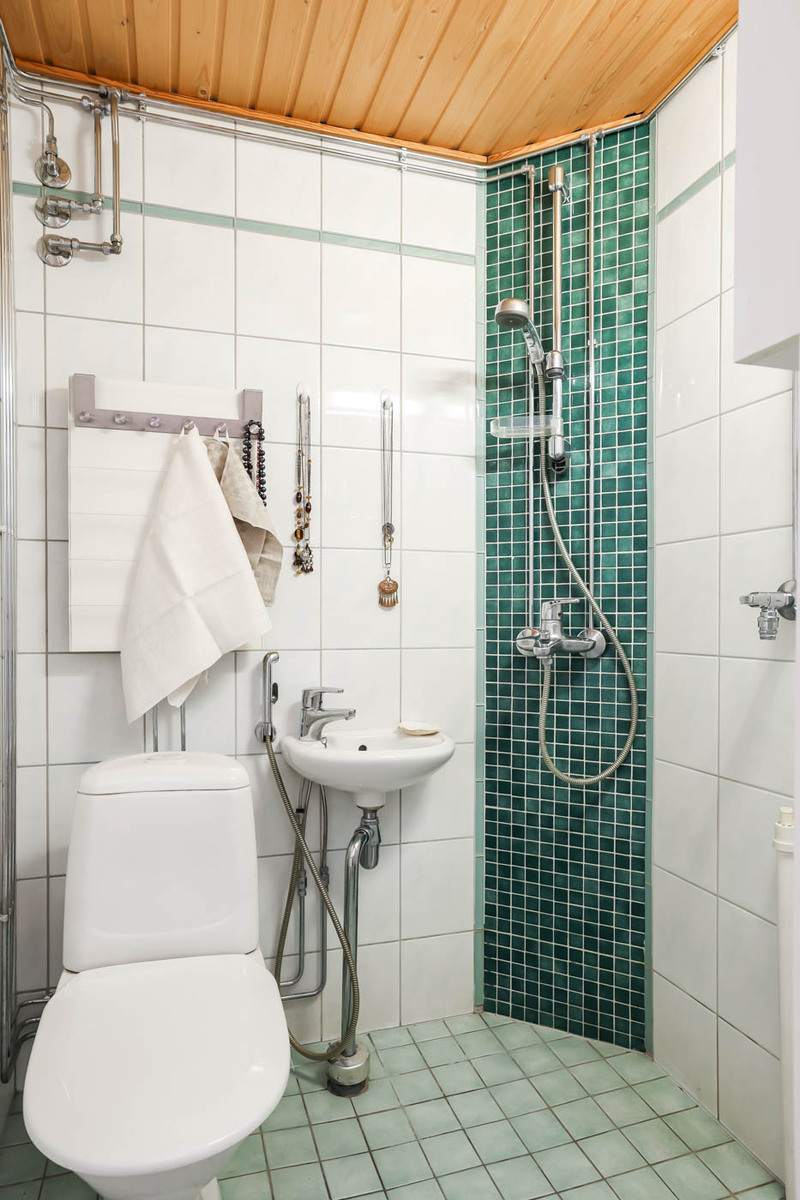 | Kylpyhuoneen kuvaus | WC-istuin, suihku, peilikaappi ja lattialämmitys, seinät (kaakeli), lattiat (laatta), Kph uusittu LVIS-remontin yhteydessä 2005. KPH:ssa rättipatteri. |